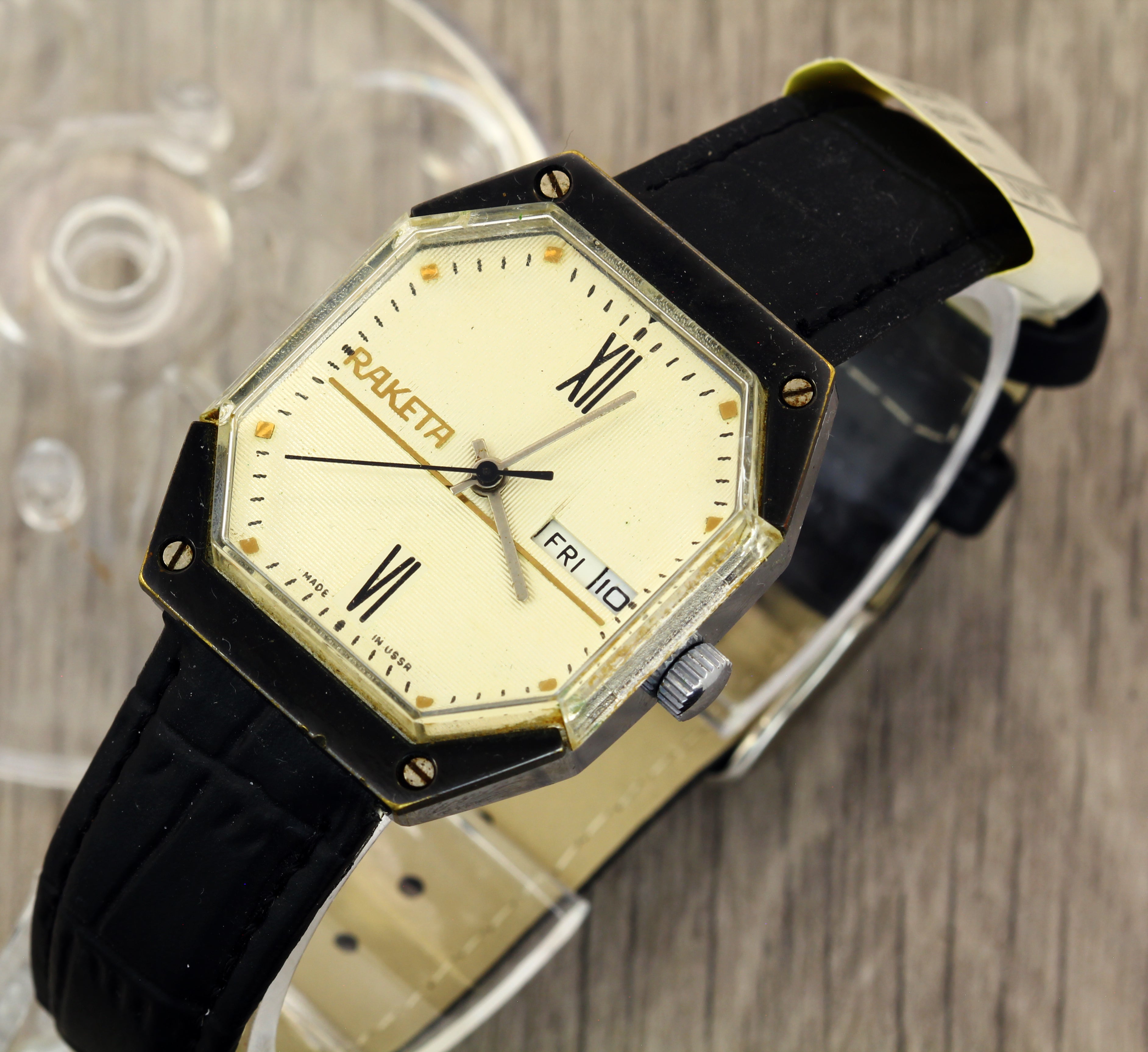 Whether worn for business or leisure, the Raketa 2628.H Octagon Soviet Mechanical Men's Wristwatch with Day and Date Function (Export Version) is a timeless accessory that exudes sophistication and style. With its combination of form and function, it serves as a tribute to the enduring legacy of Raketa and the global appeal of Soviet watchmaking excellence.