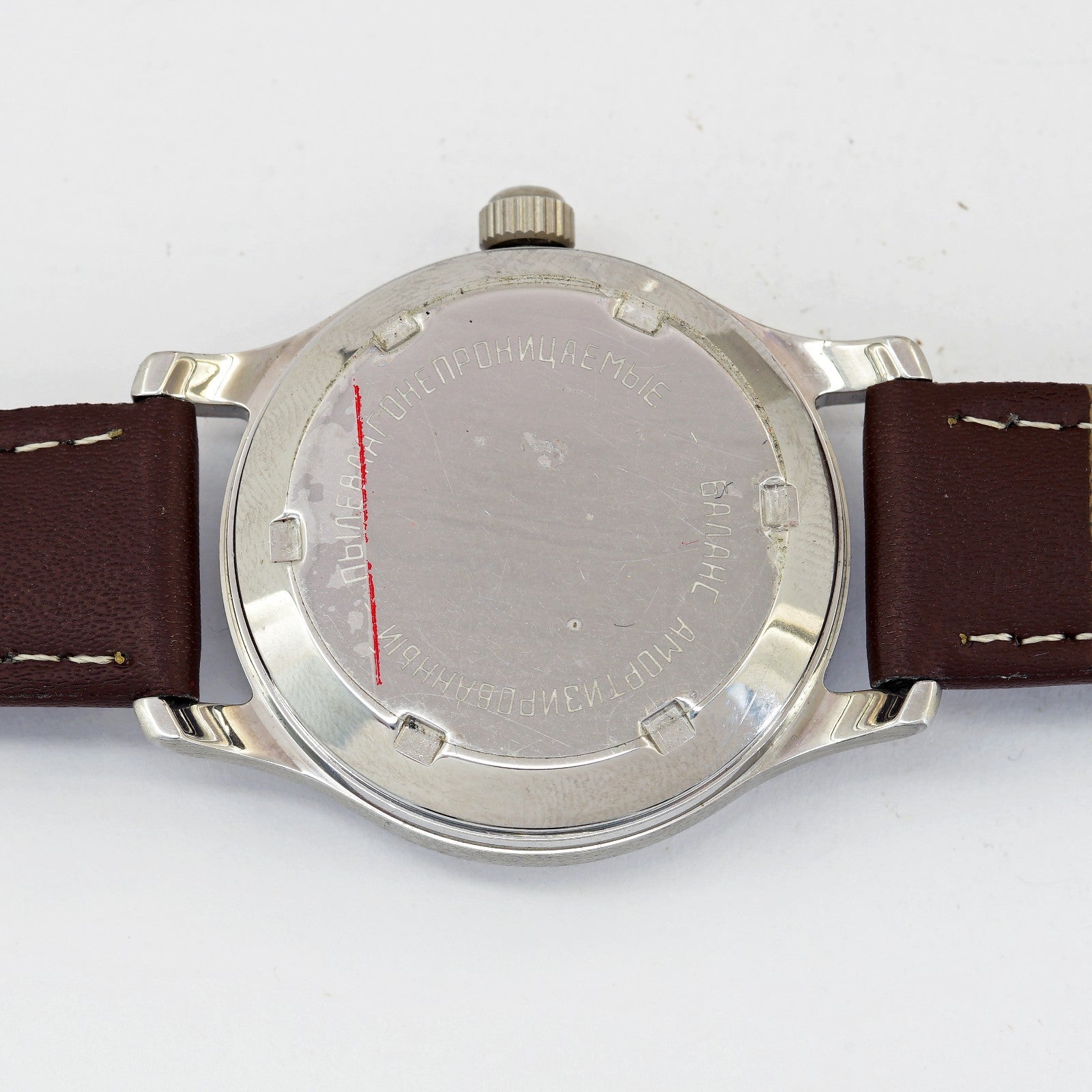 The dial of a typical 1950s Sturmanskie features clean, legible Arabic numerals, often in a classic black or dark blue tone, with luminous markings to ensure visibility in low-light settings. The simple, no-nonsense design is complemented by slender hands. The watch has a modest case size (usually around 33-36mm) with a stainless steel case back, which, while small by modern standards, adds to its vintage appeal.