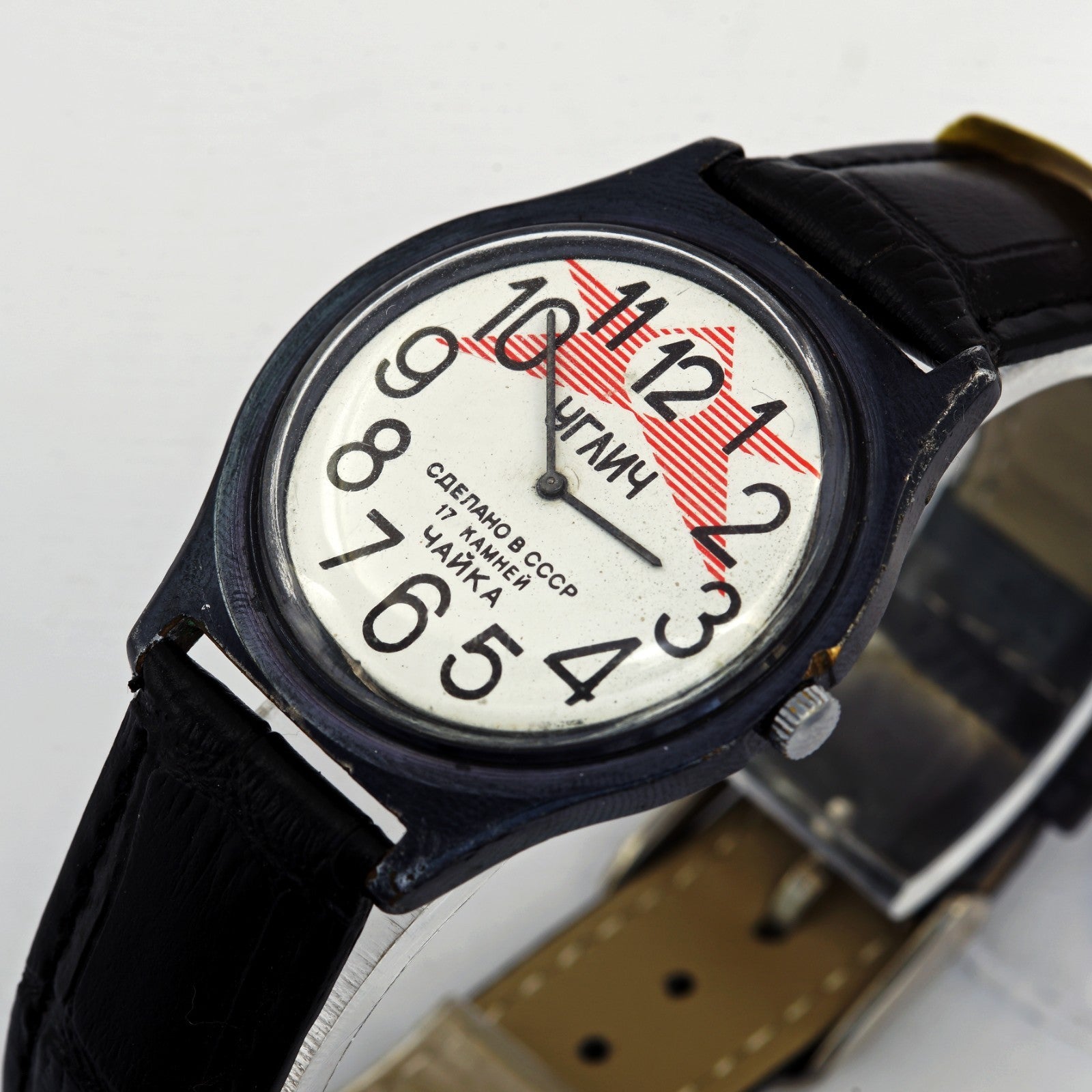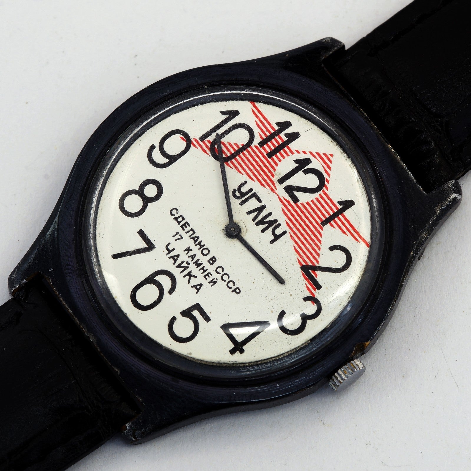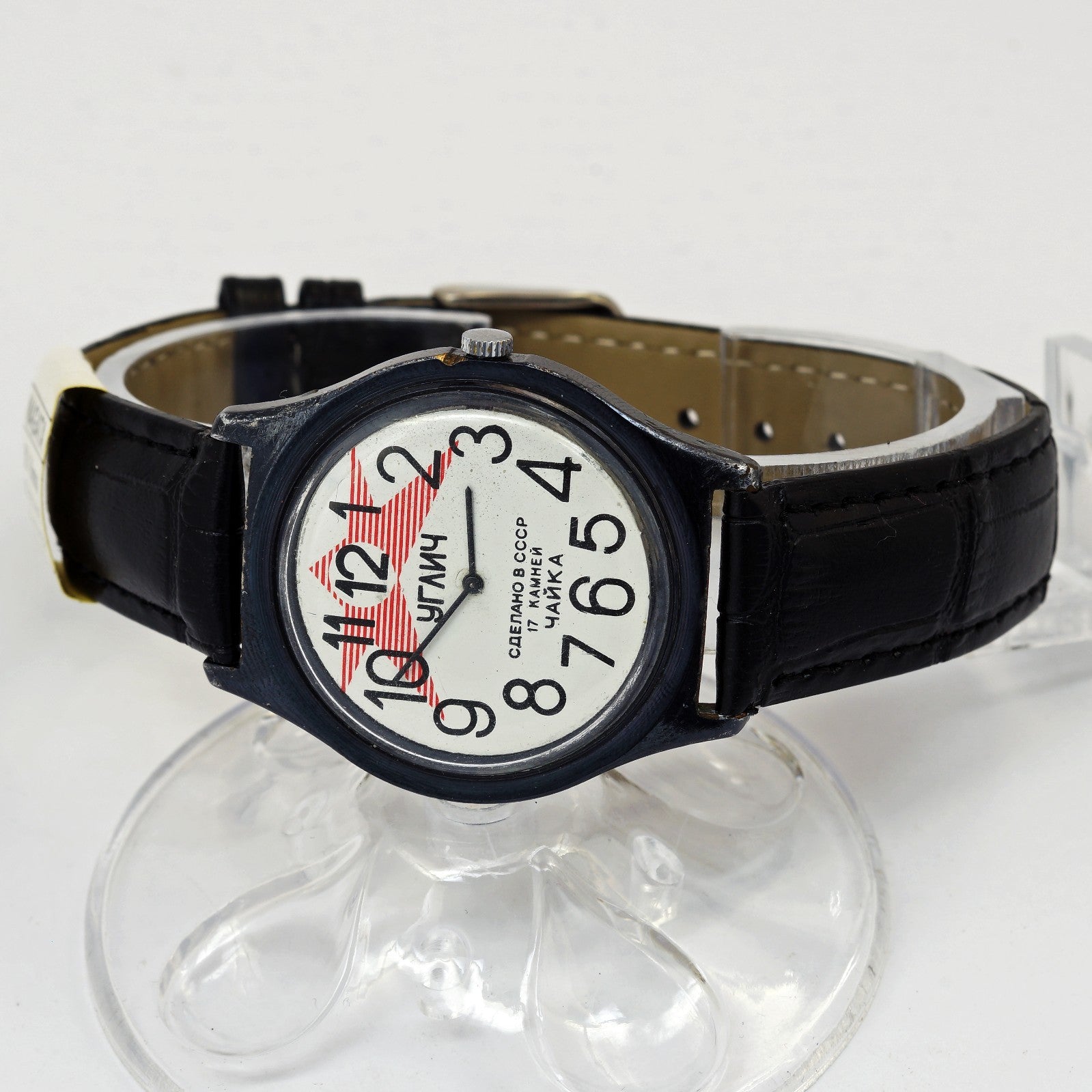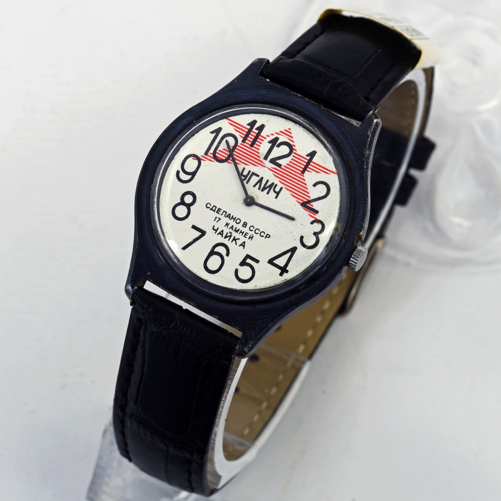 Inscriptions on the dial: chaika Uglich, 17 jewels and made in USSR. Red star on the dial