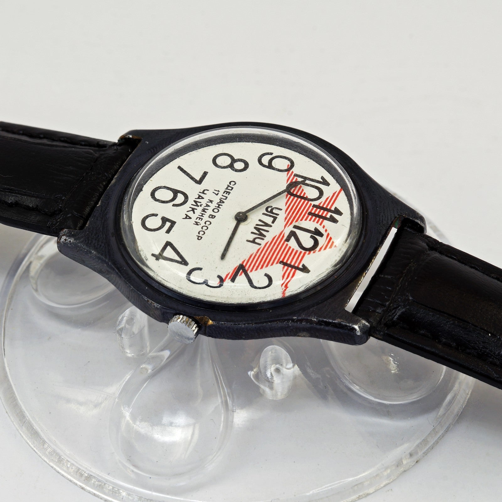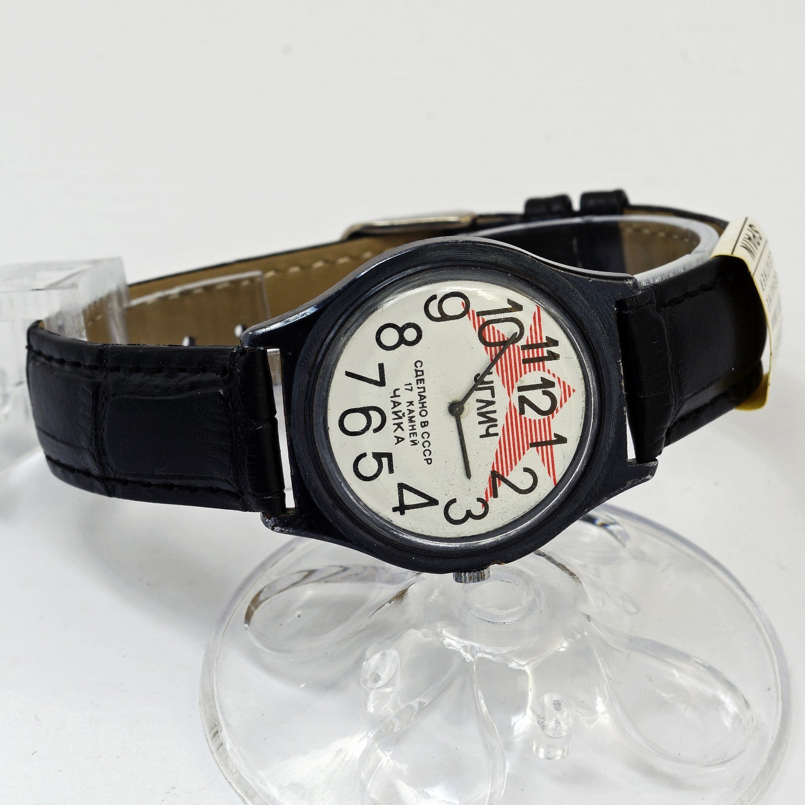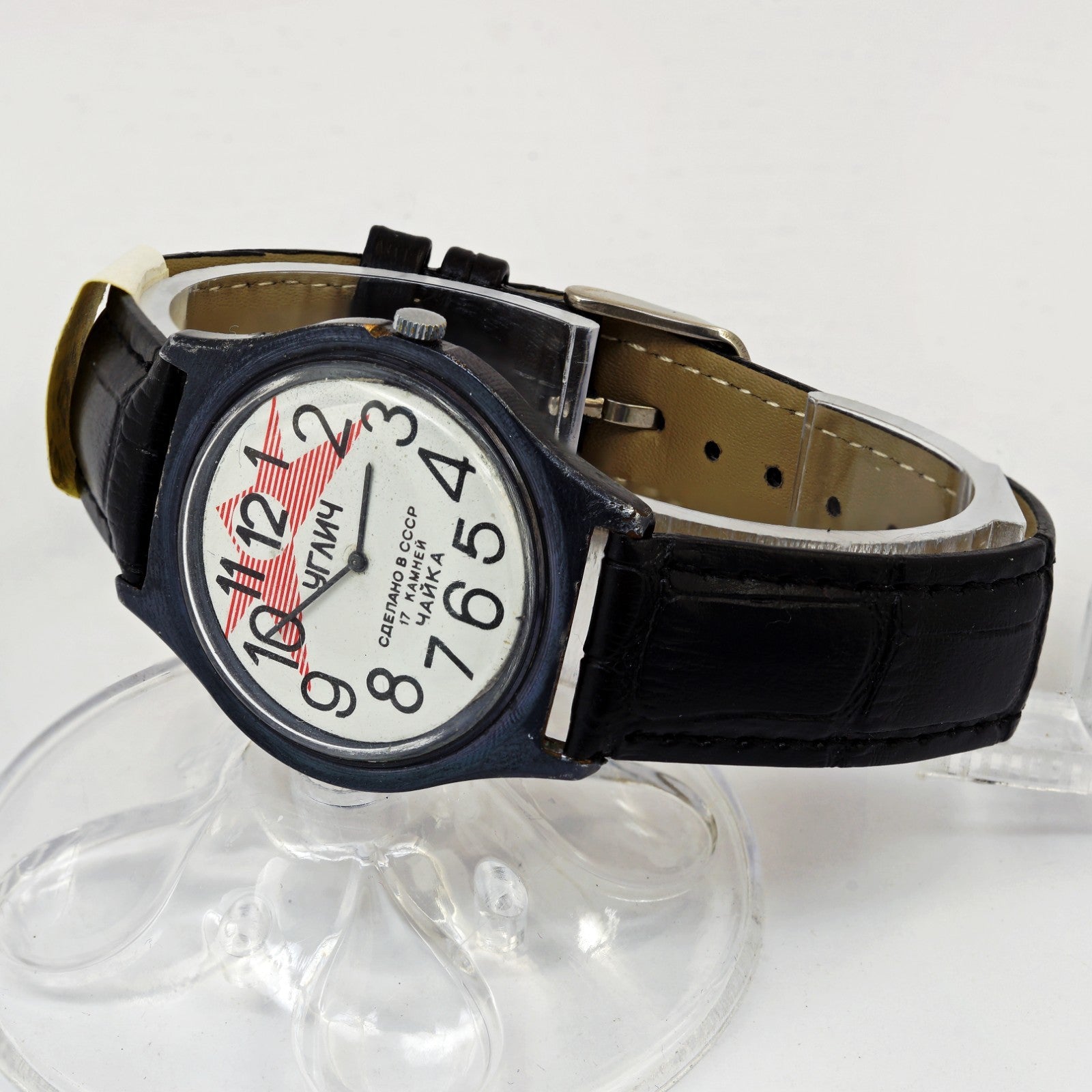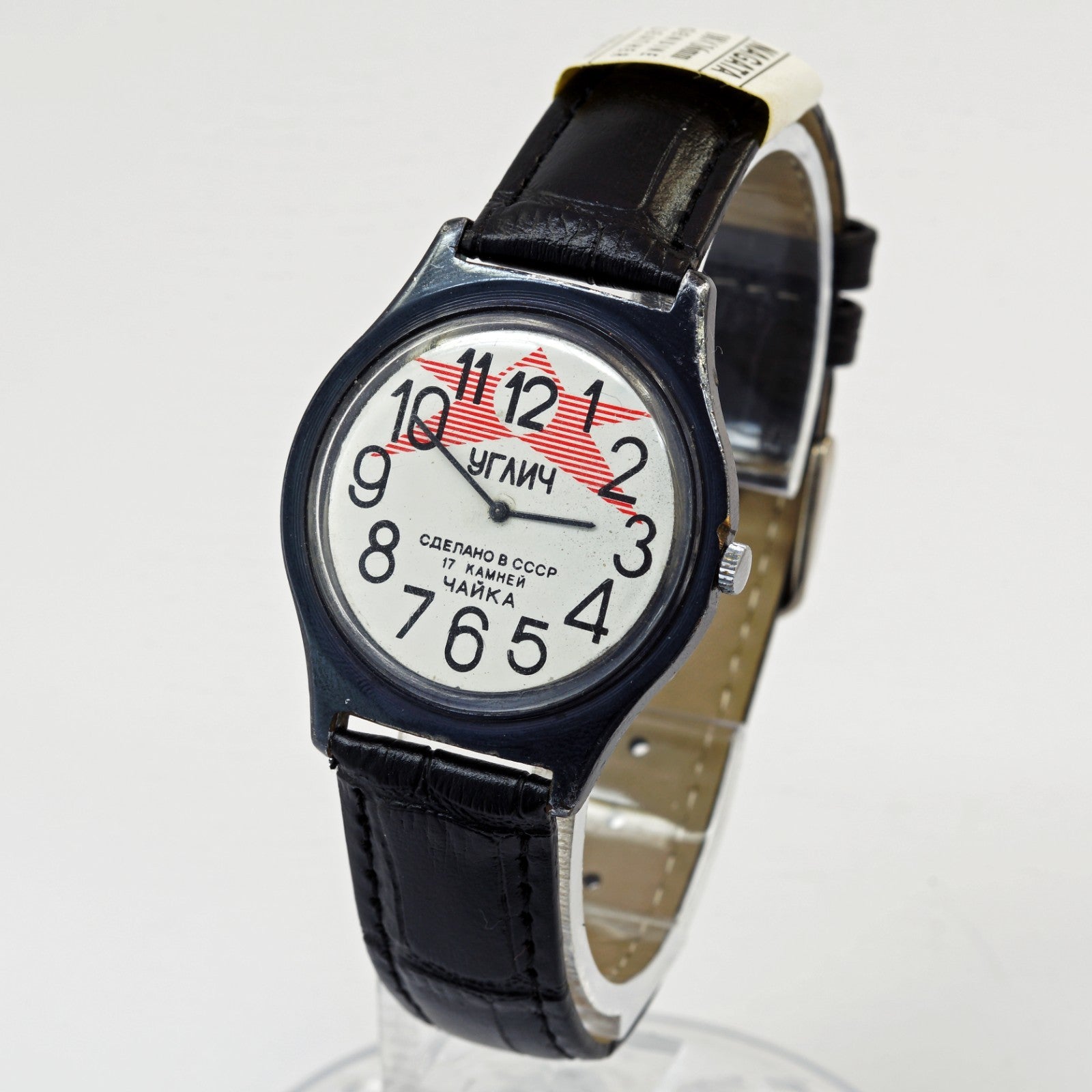 Inscriptions on the dial: chaika Uglich, 17 jewels and made in USSR. Red star on the dial