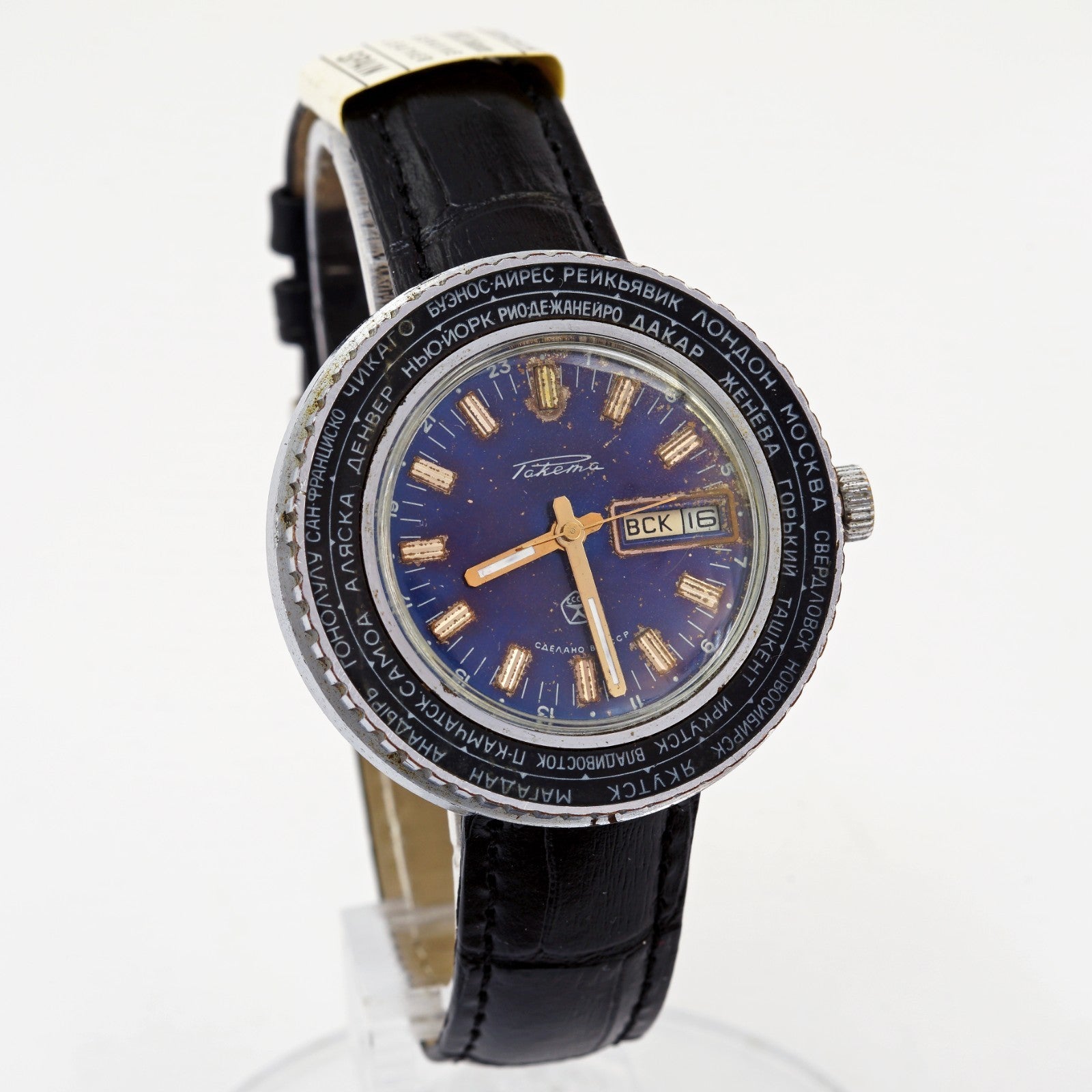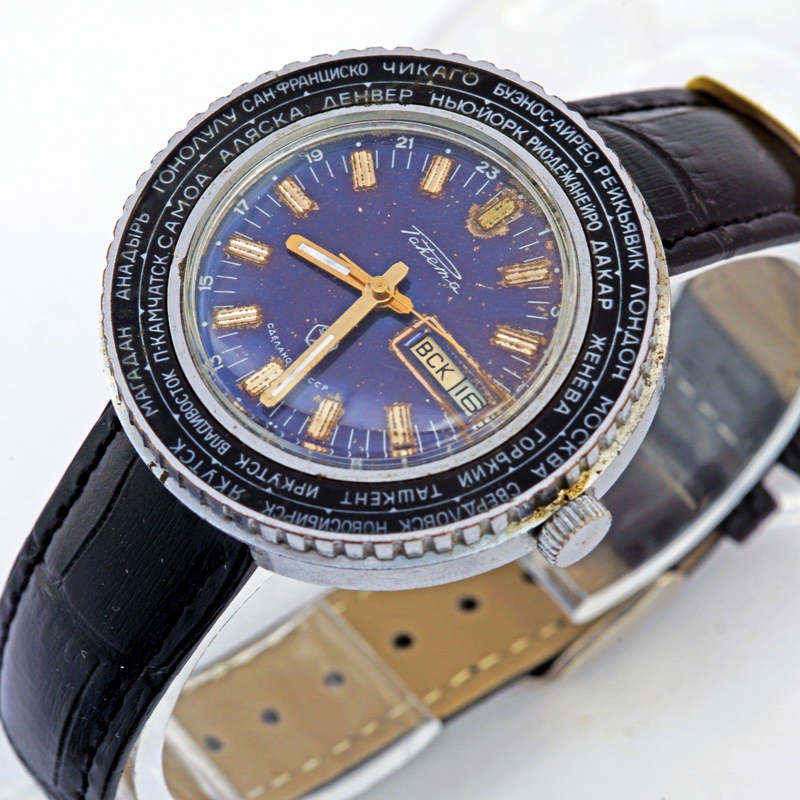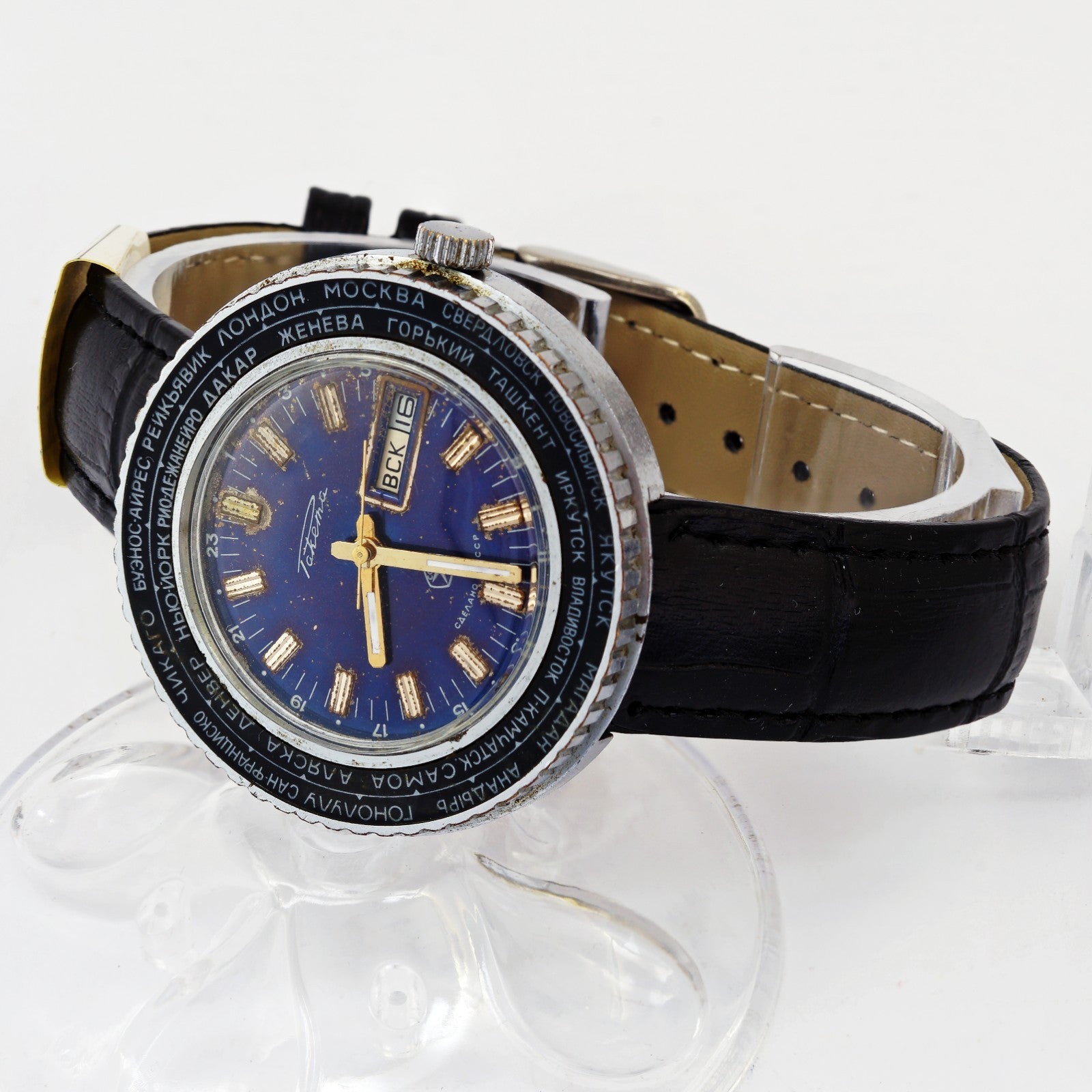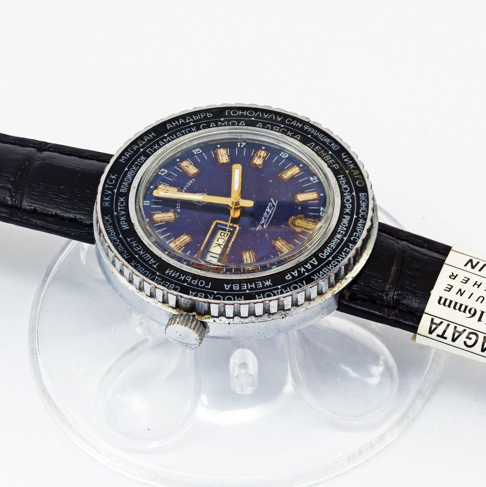 Raketa 2628 world time rare USSR Soviet men's wristwatch PChZ day date blue dial