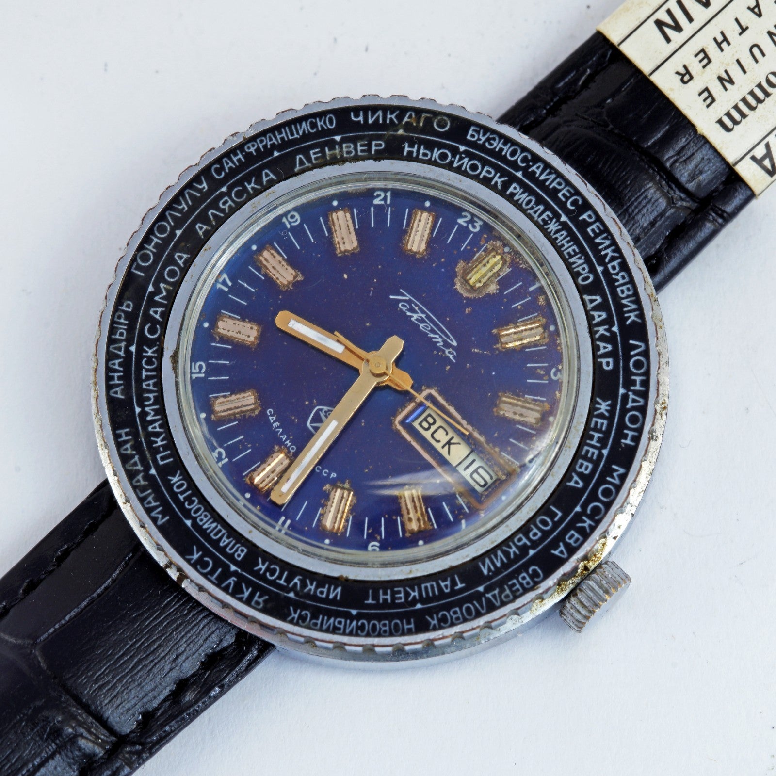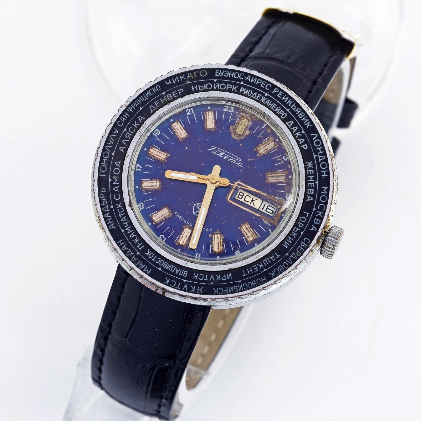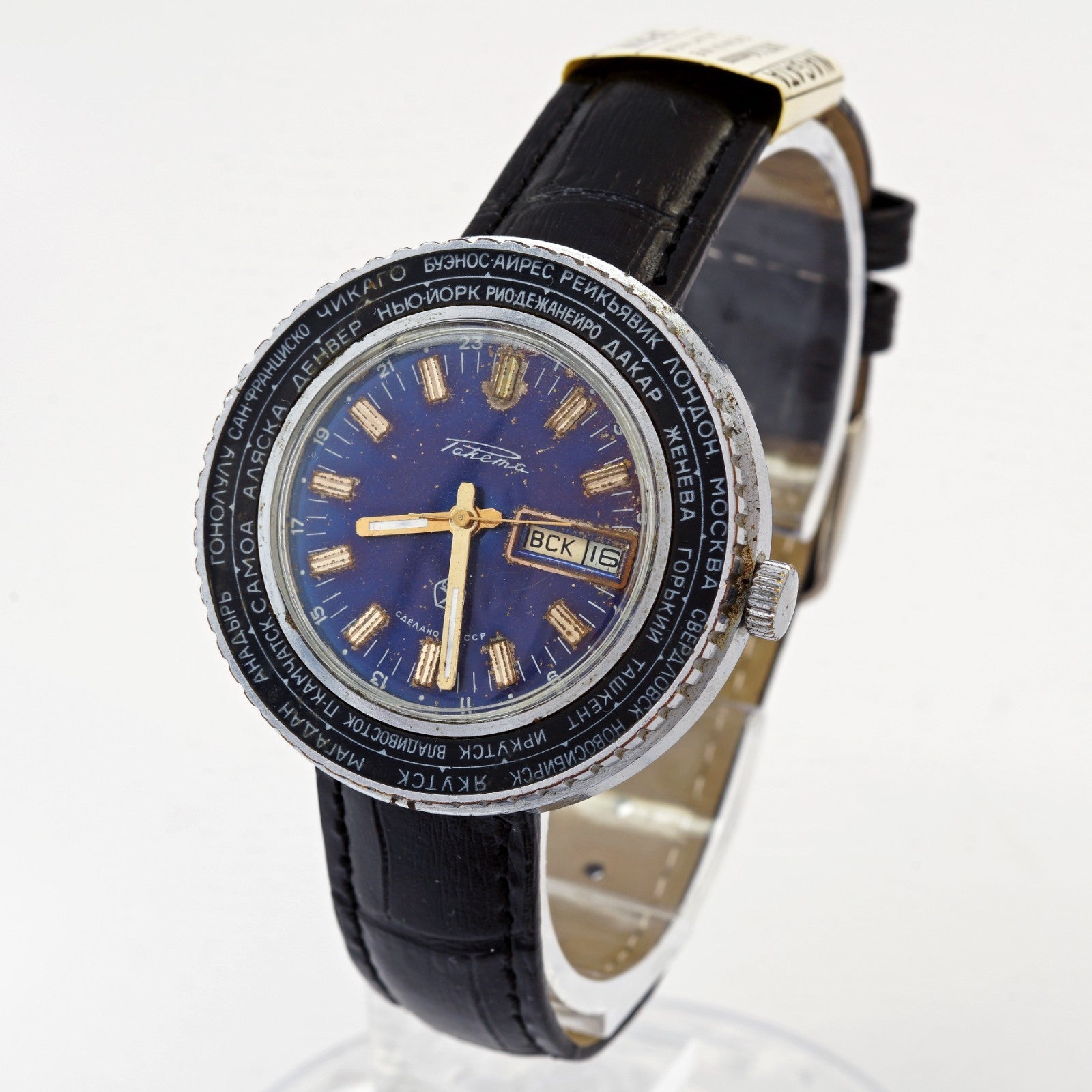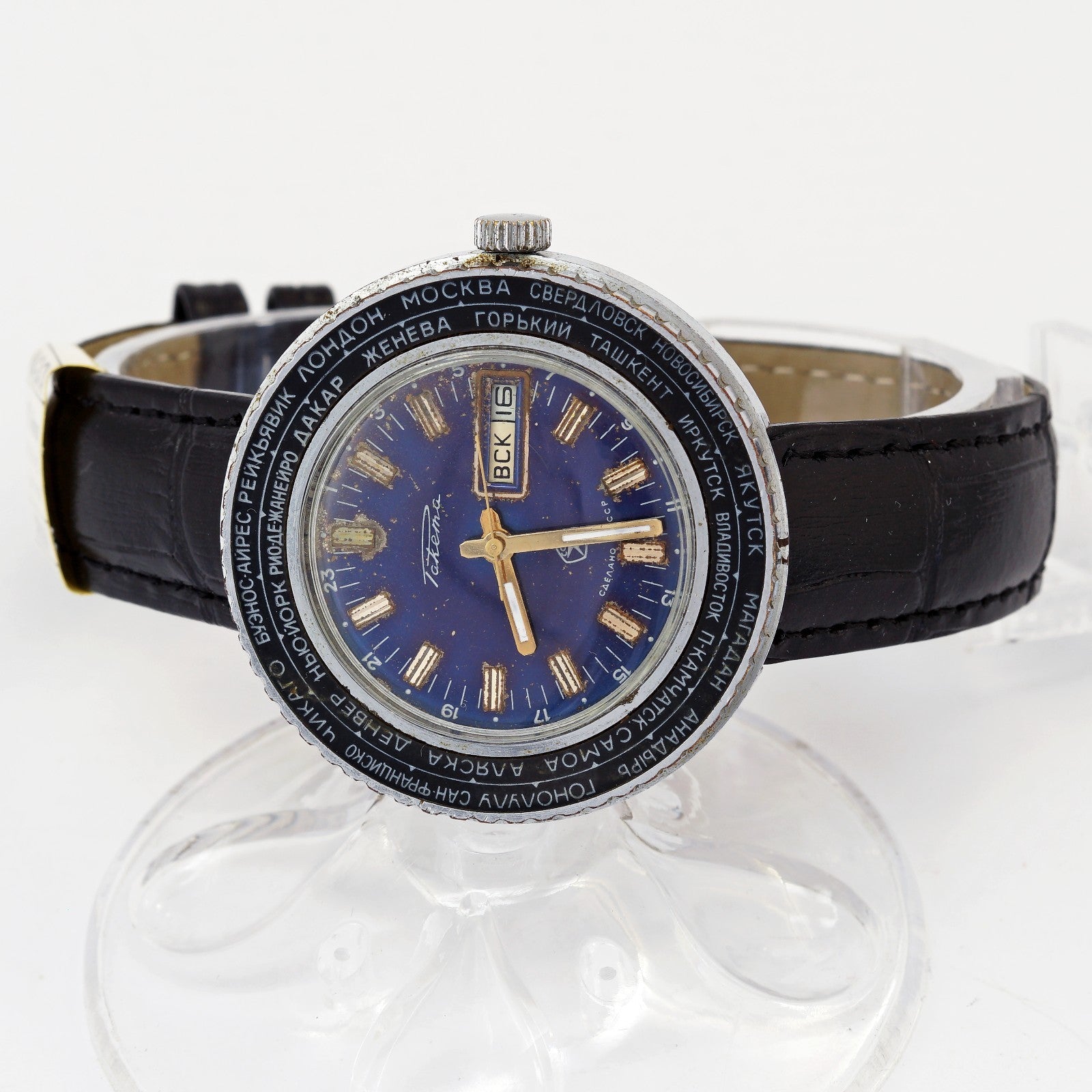 Raketa 2628 world time rare USSR Soviet men's wristwatch PChZ day date blue dial