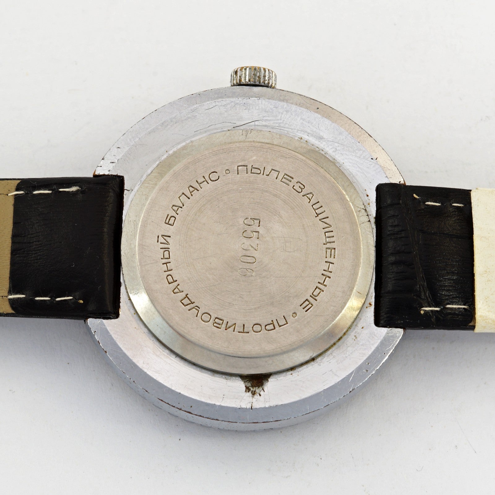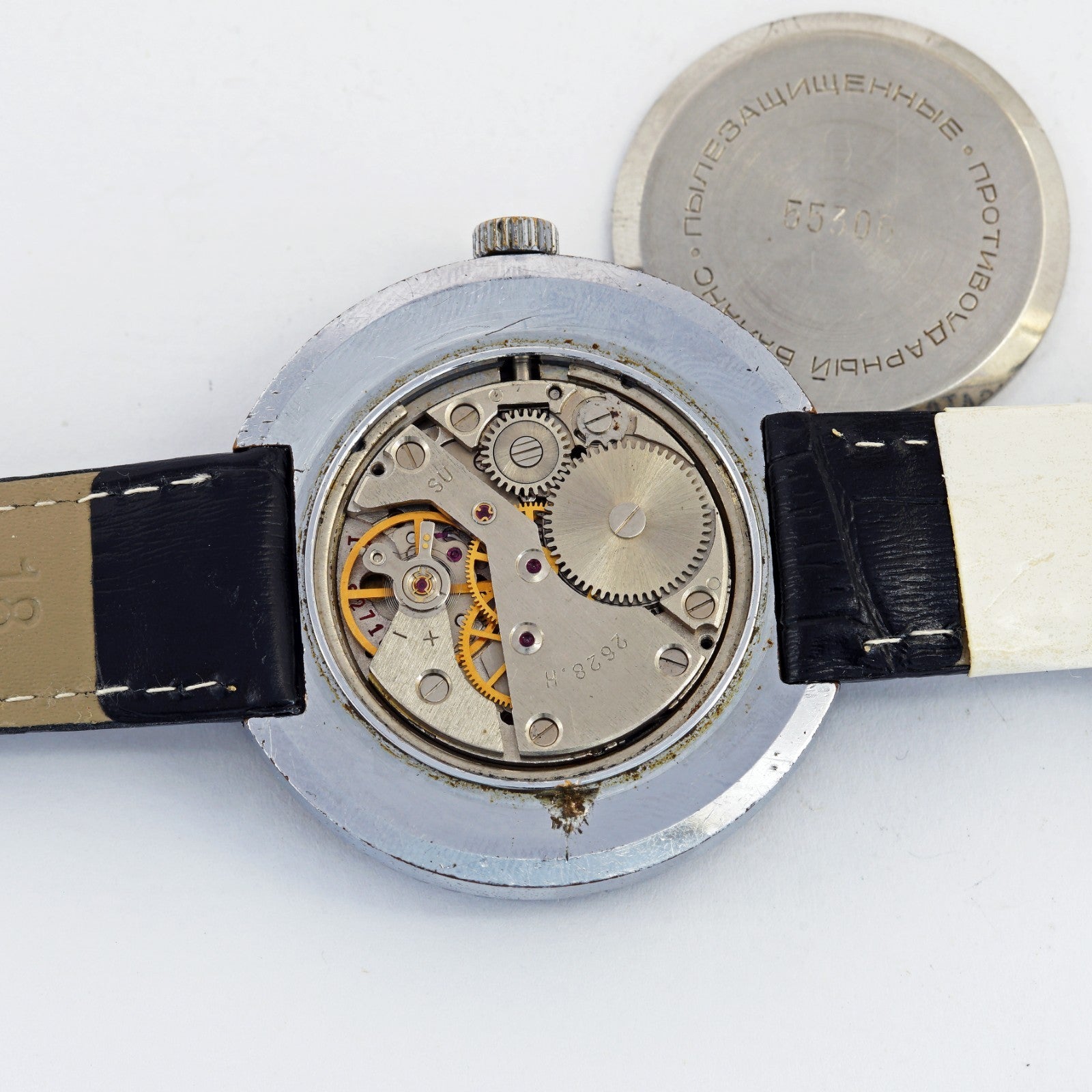In addition to its primary function, the watch offers a practical day and date display, elegantly positioned to enhance usability. The mechanical movement, meticulously engineered in the heart of the Soviet Union, provides reliable and accurate timekeeping, reflecting the era's dedication to quality and innovation.