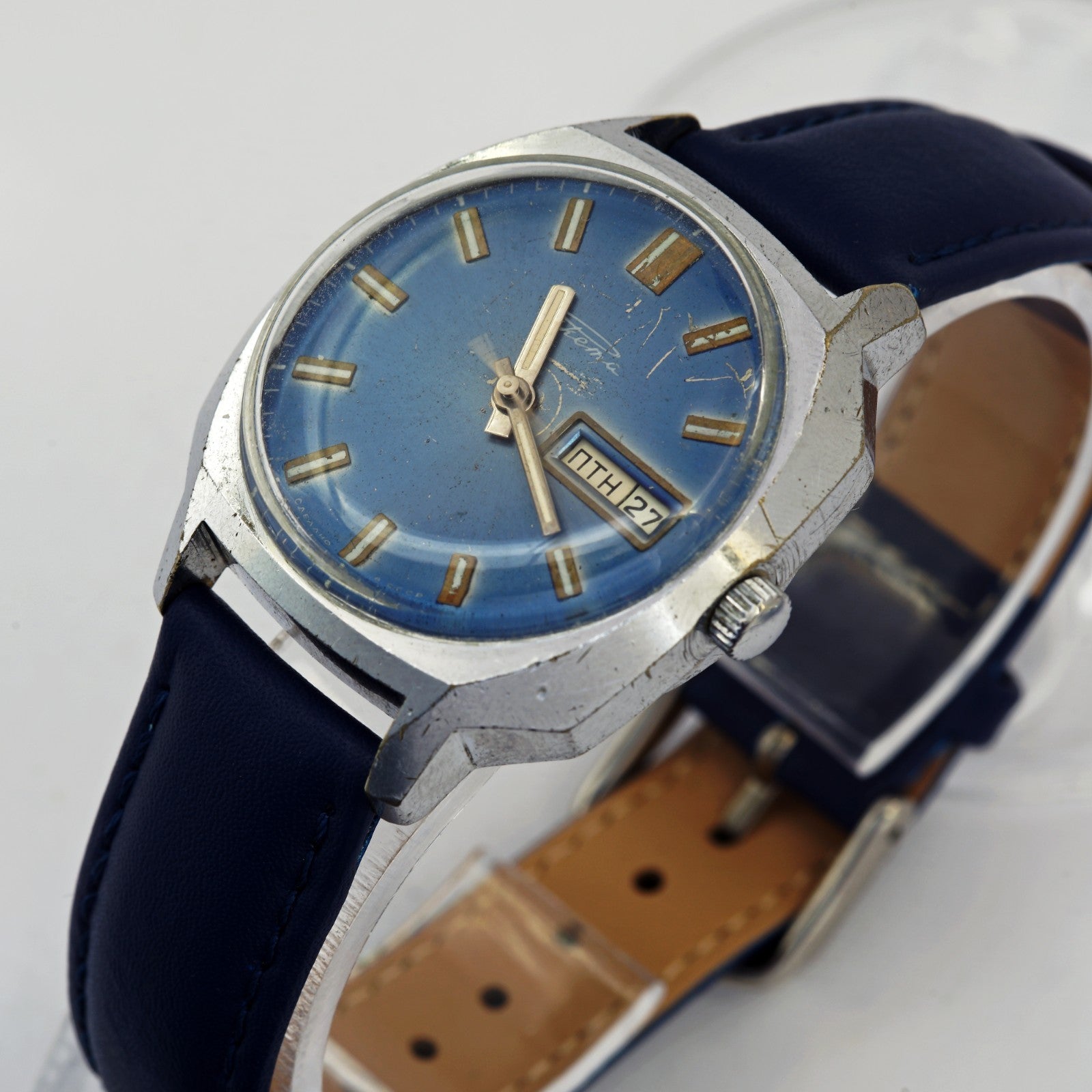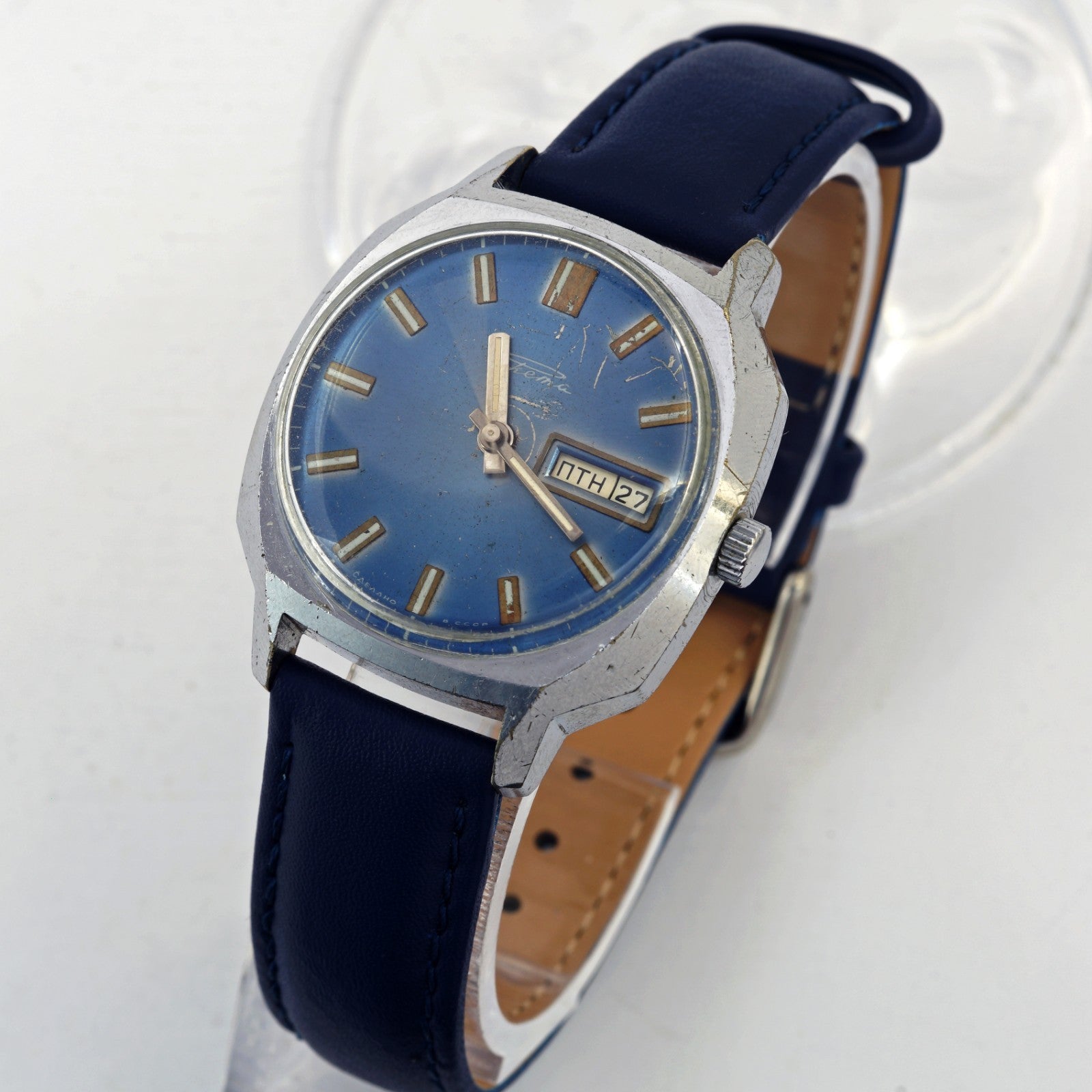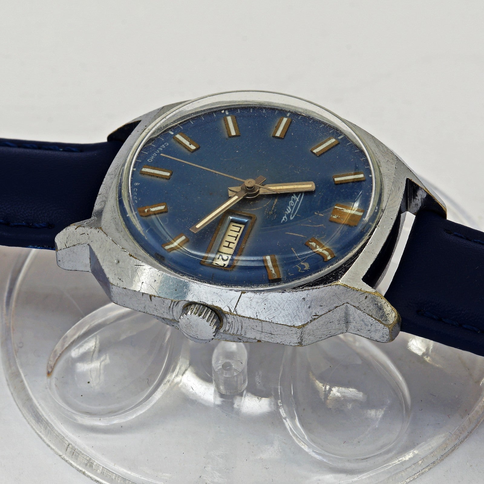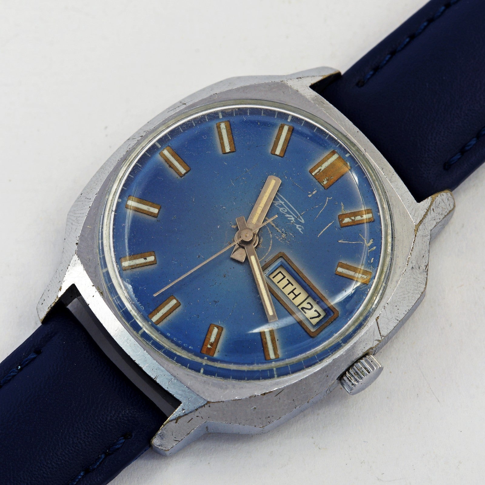 Rare RAKETA 2627.H men's automatic wristwatch with day and date indicator. Blue dial