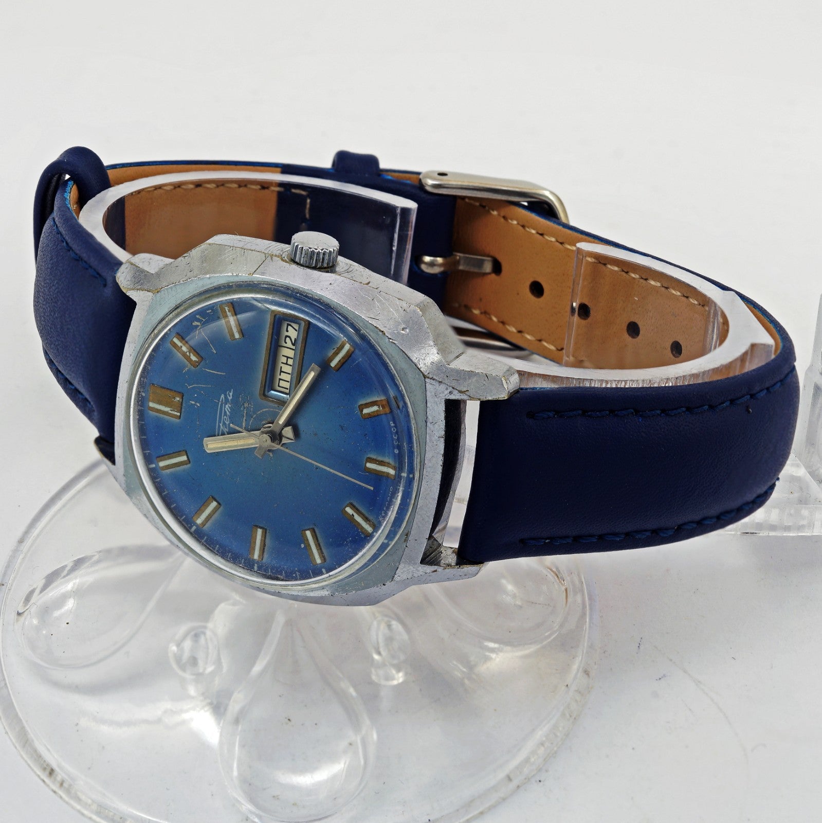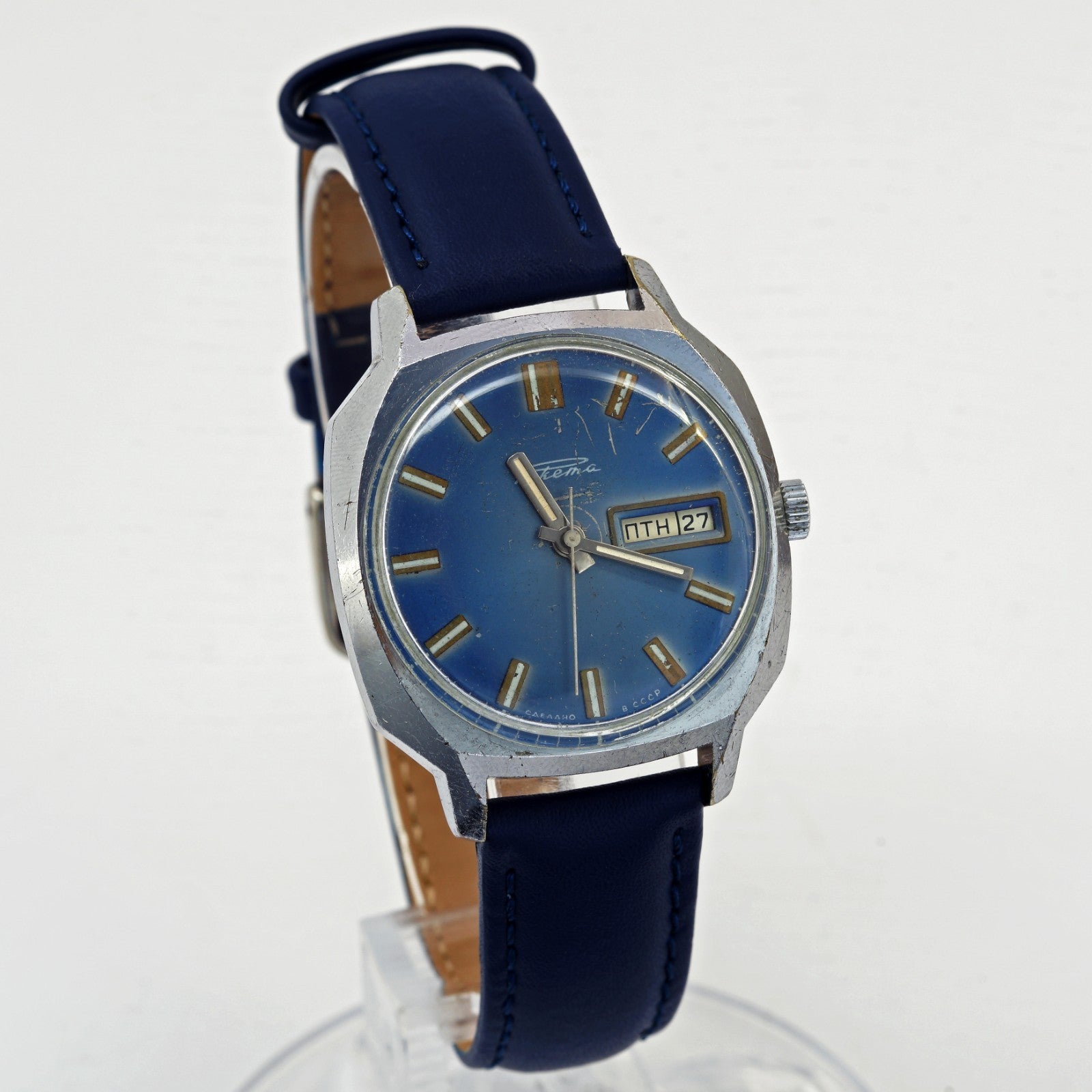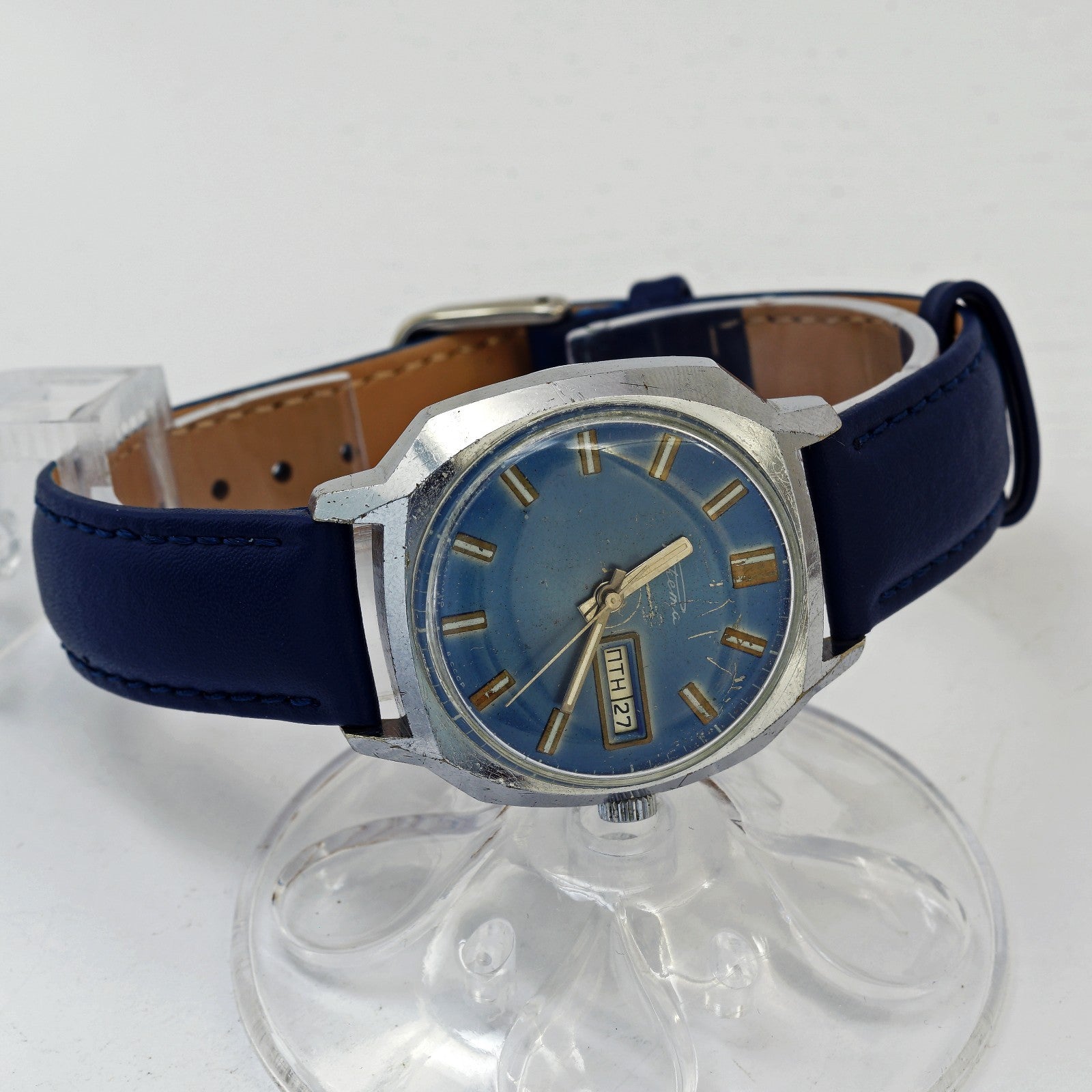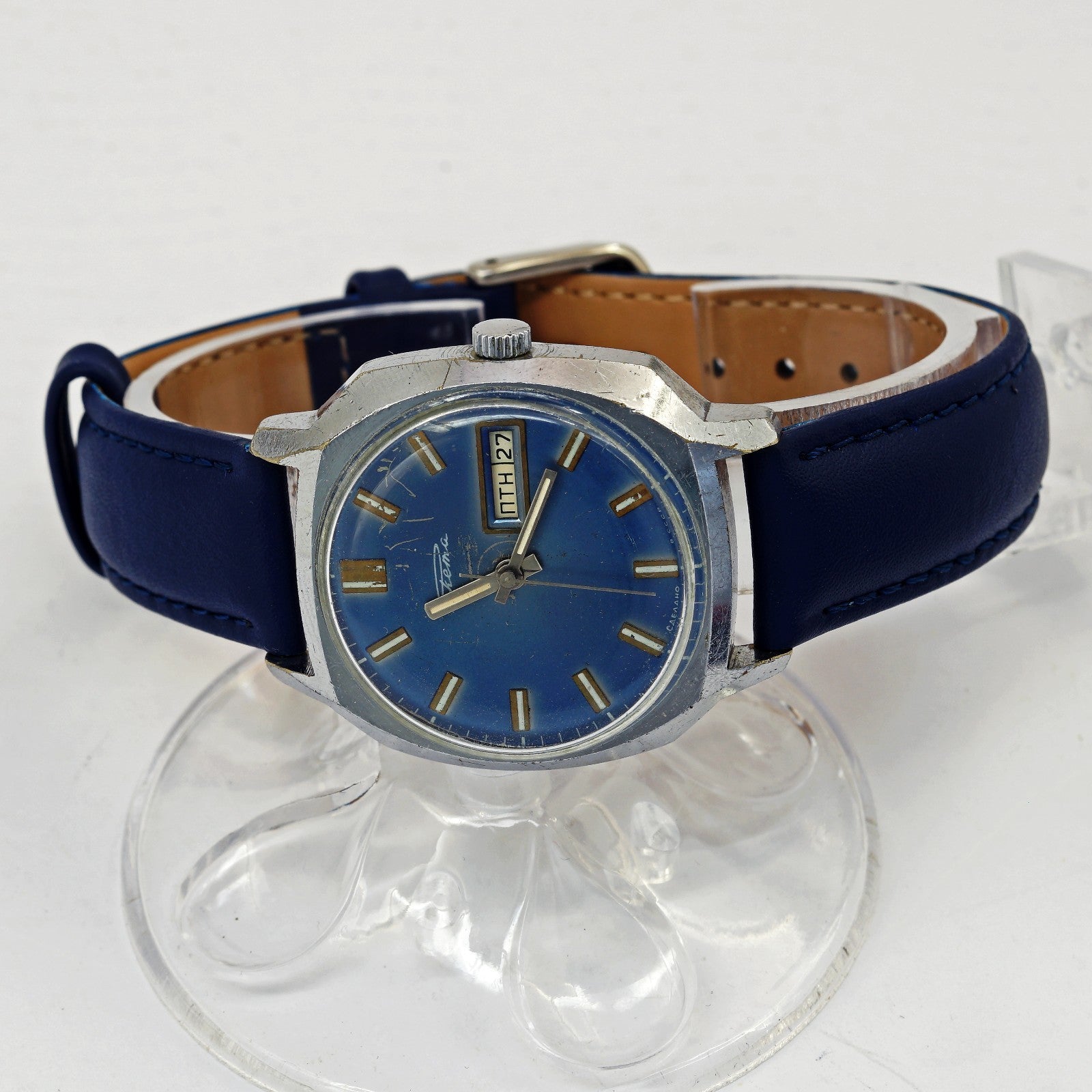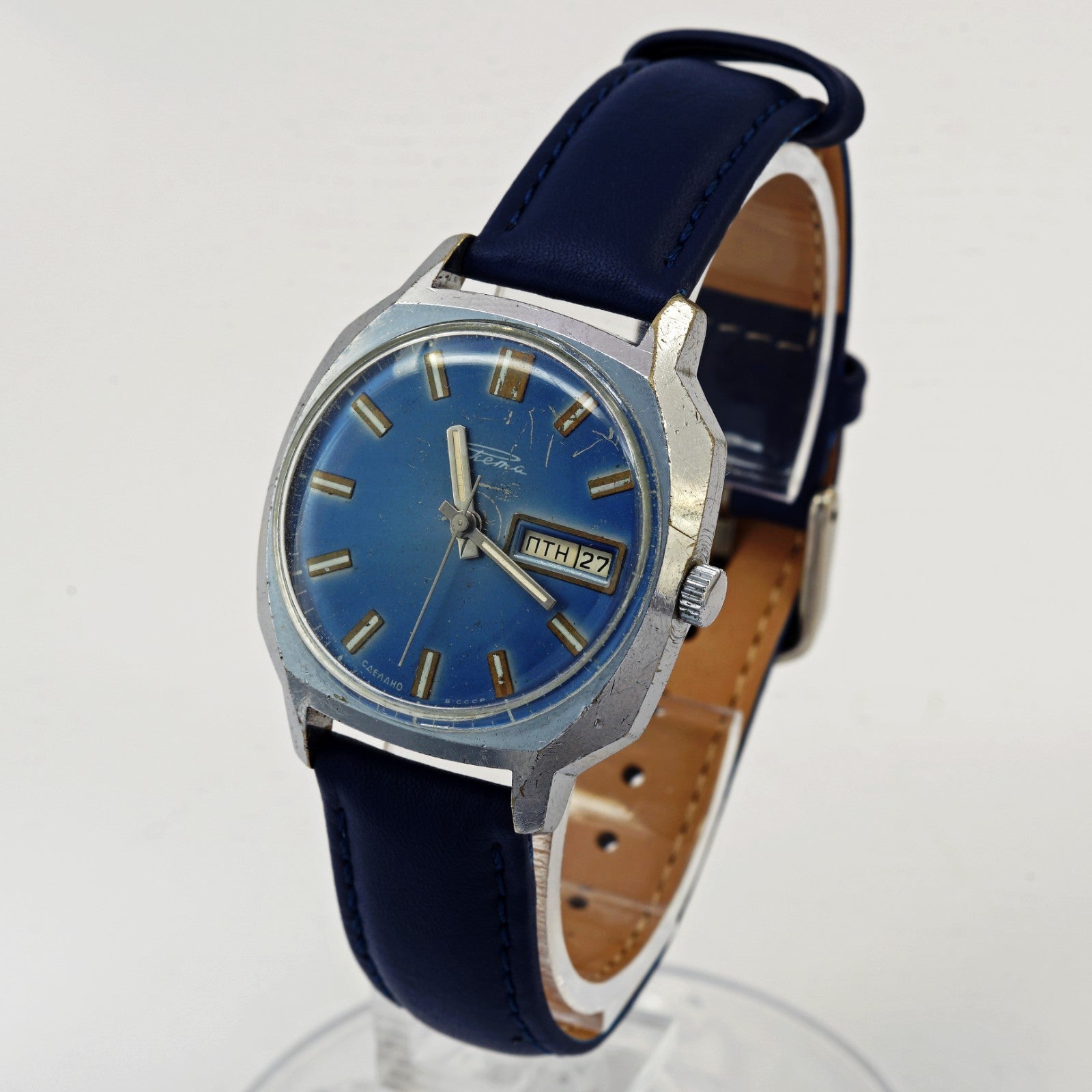 Rare RAKETA 2627.H men's automatic wristwatch with day and date indicator. Blue dial