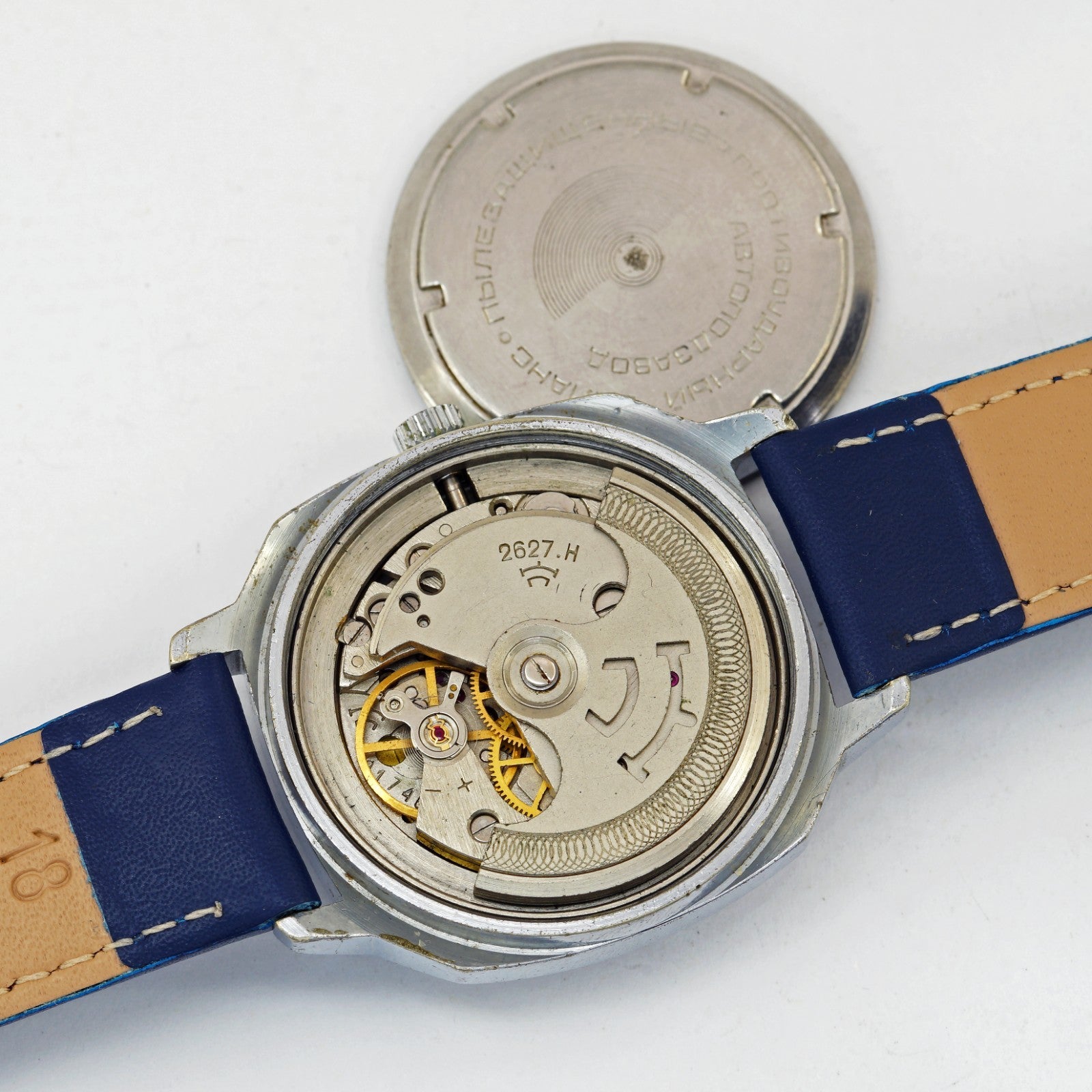 The caliber has some engravings: serial number, 2627.H (caliber) and Raketa logo
