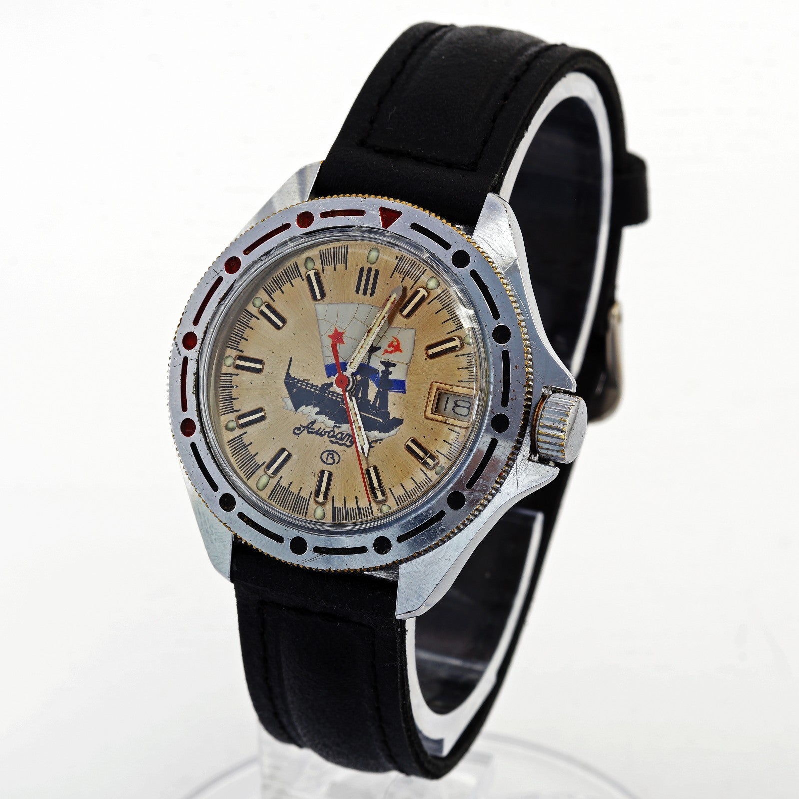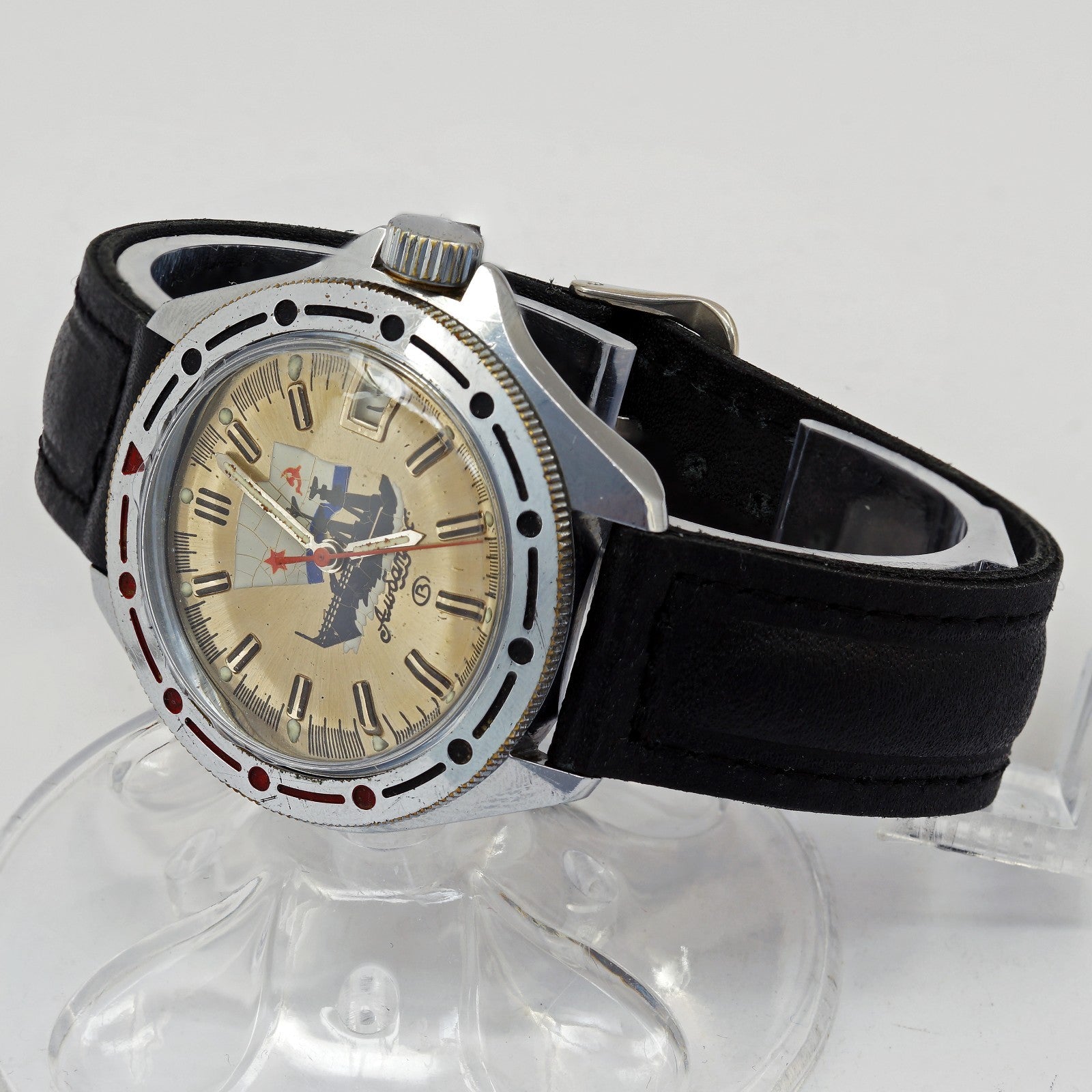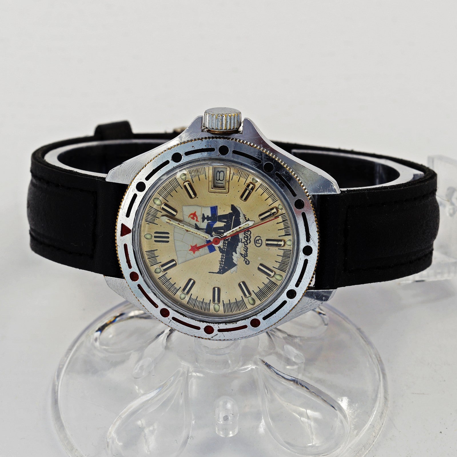 In the Soviet clock industry an Amfibia watch was what the west would call a "Diver" watch. Produced in great quantities for the Soviet and Russian military, these watches gained great popularity worldwide. The Vostok Amphibia or Raketa Amphibia are Russian diving watch created respectively in 1967 and 1968 for the USSR's navy.