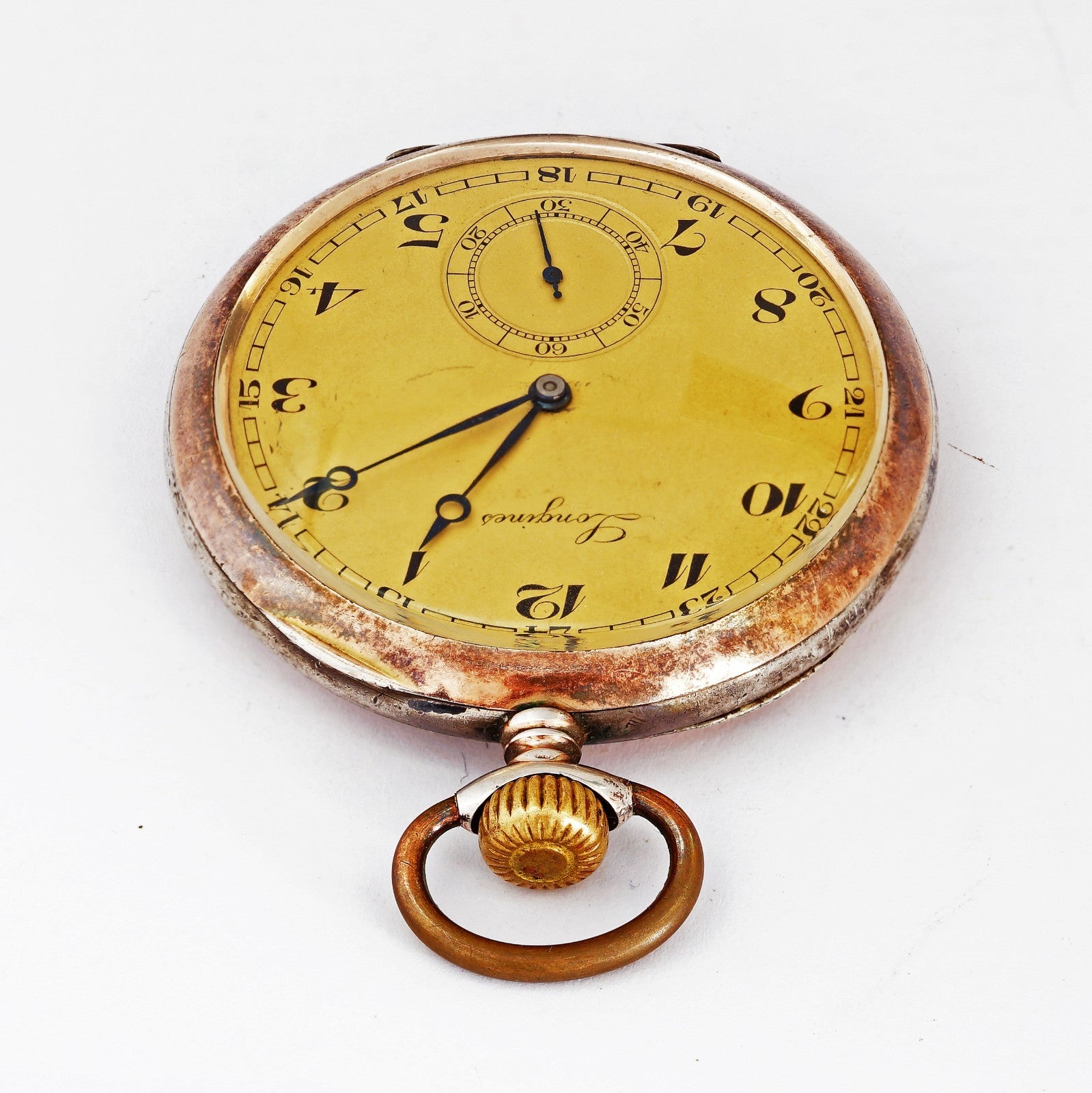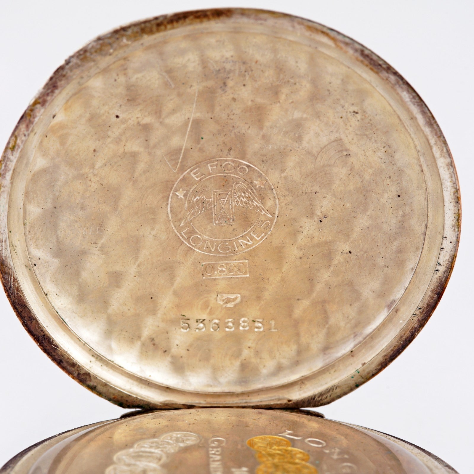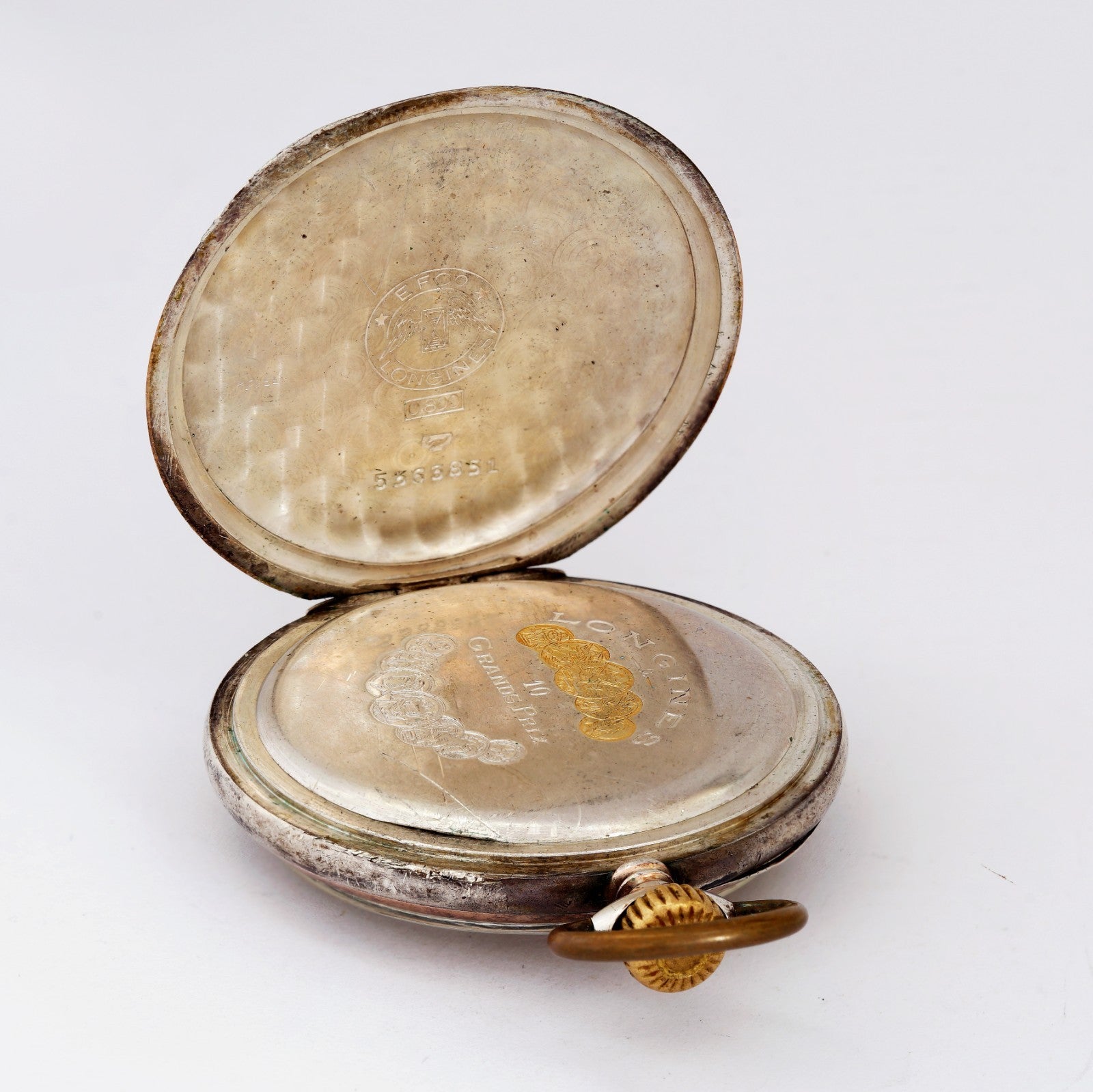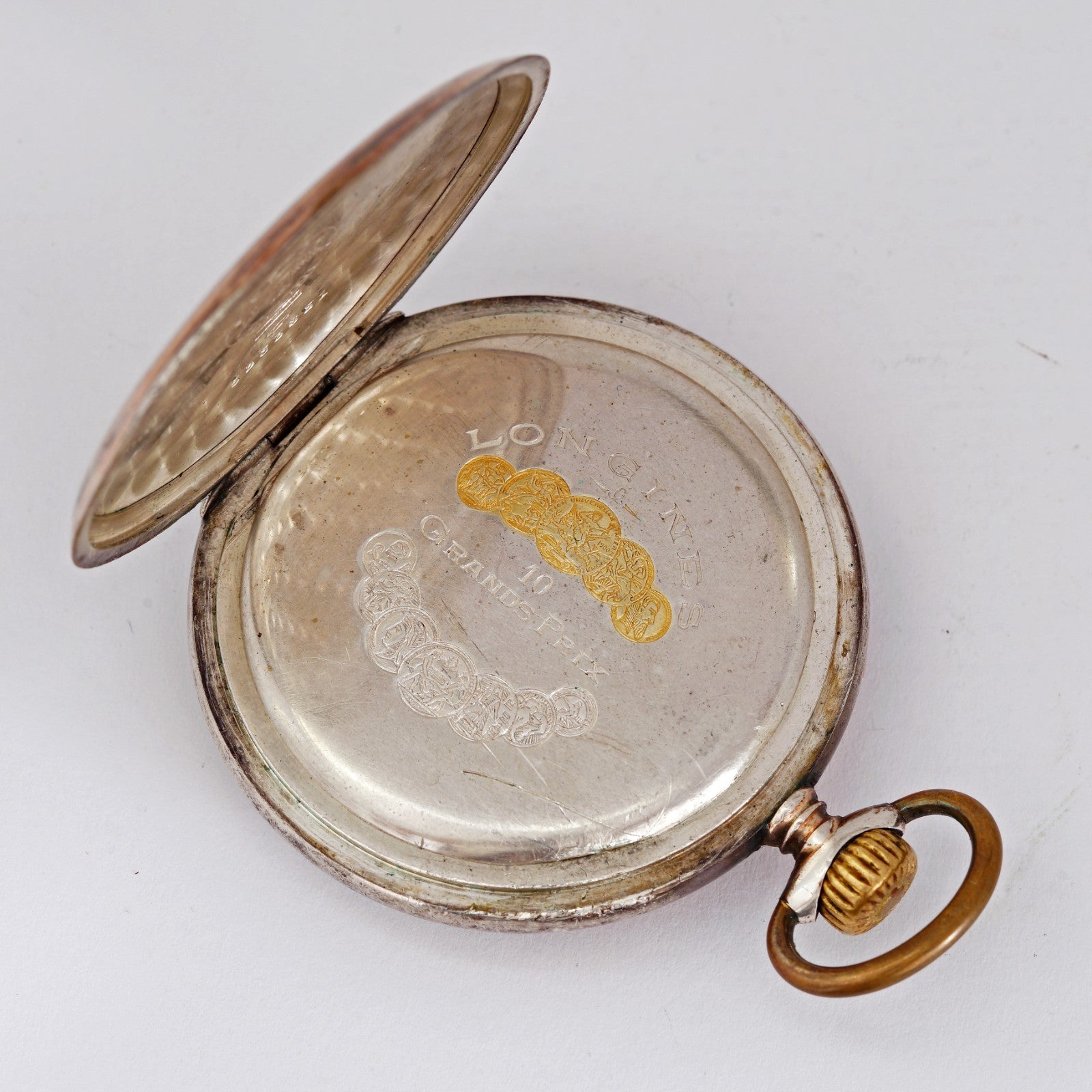 1930's Unique vintage Longines mechanical solid silver 0.800 pocket watch. 10 Grands prix medals. Nice patina!