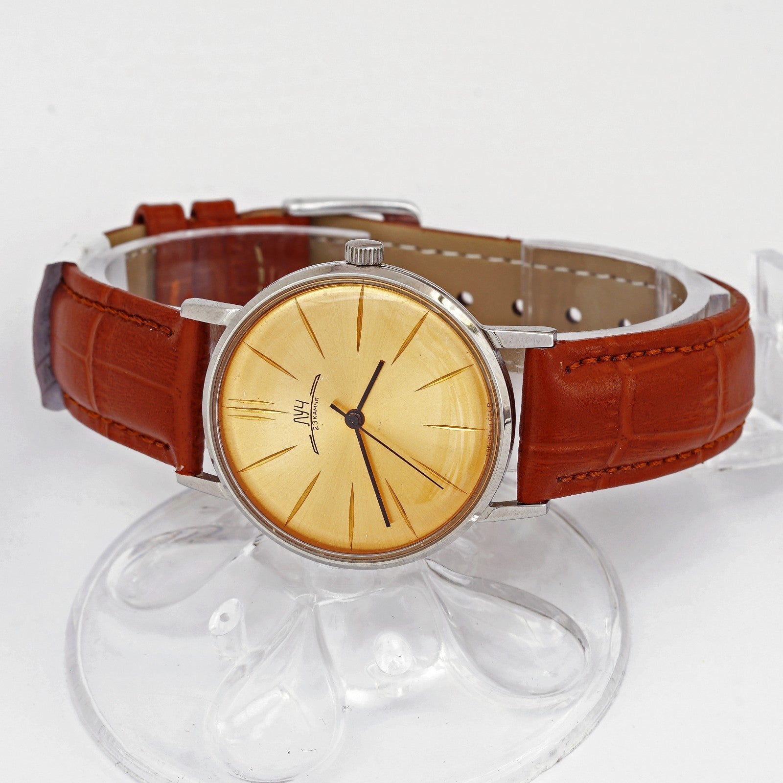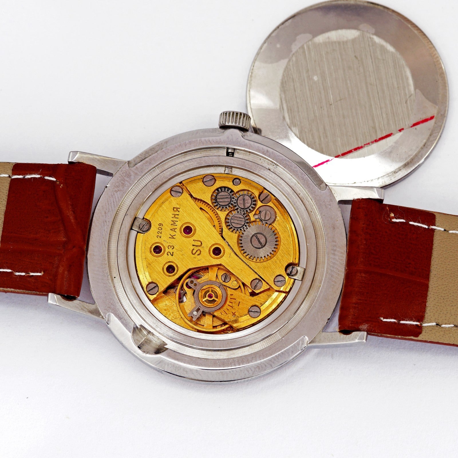 Excellent, new condition!!! The case and dial are NEW! (this means that this details dial has been replaced. It is made nowadays). Please see the photos for the assessment of watches. Runs well and keeps time accurately. Really watches look much better than in the photo. New PU leather strap as a gift!