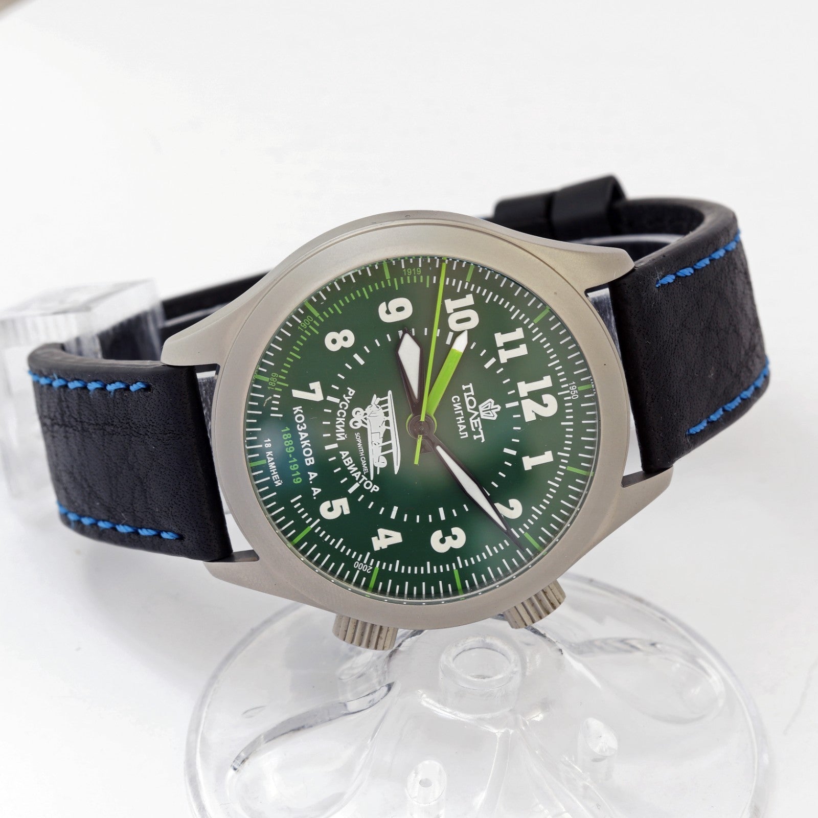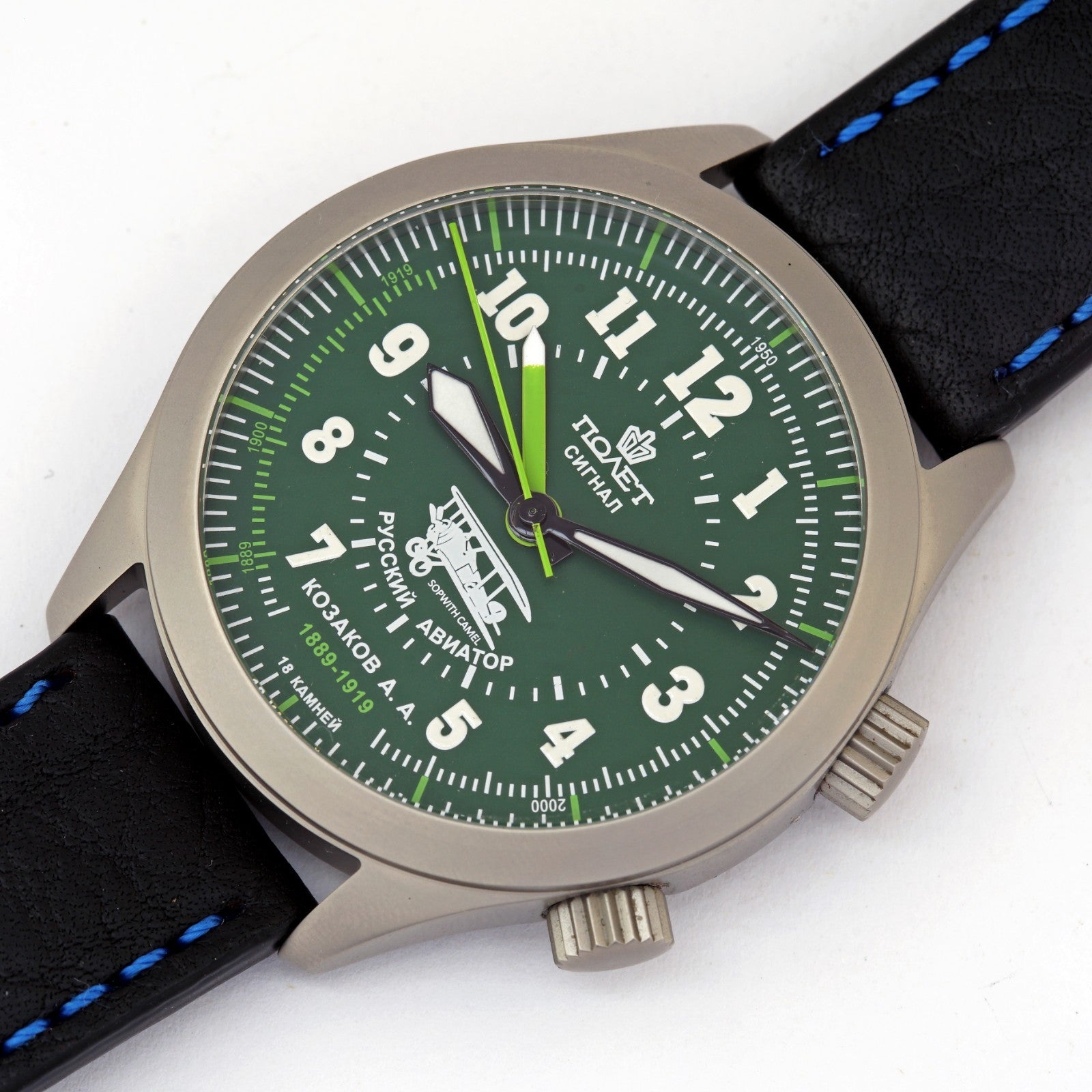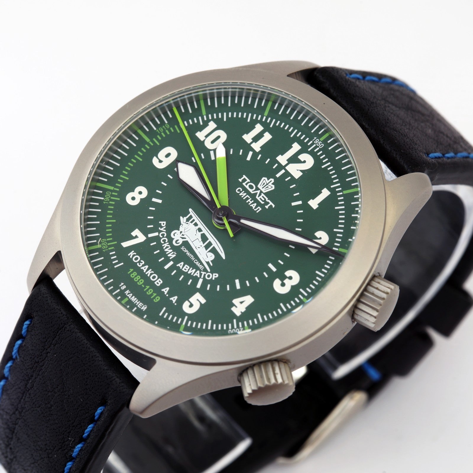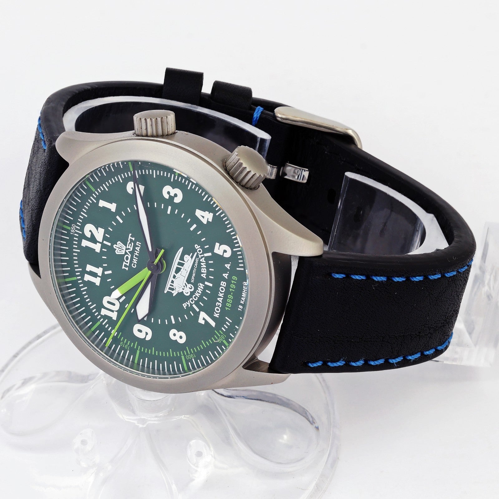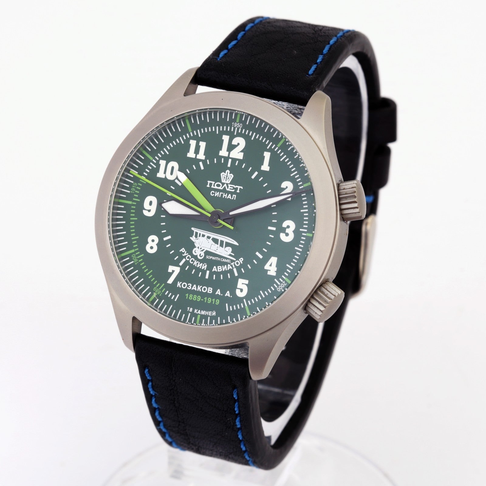 Inscriptions on the dial: Poljot signal, Russian aviator, 18 jewels, Kazakov A.A. 1889-1919