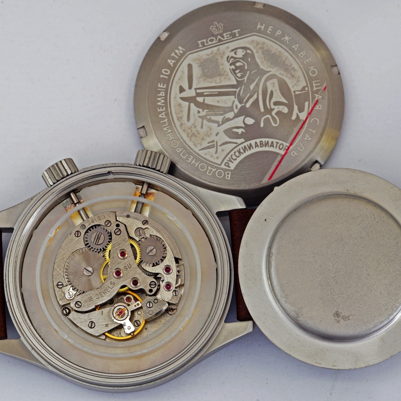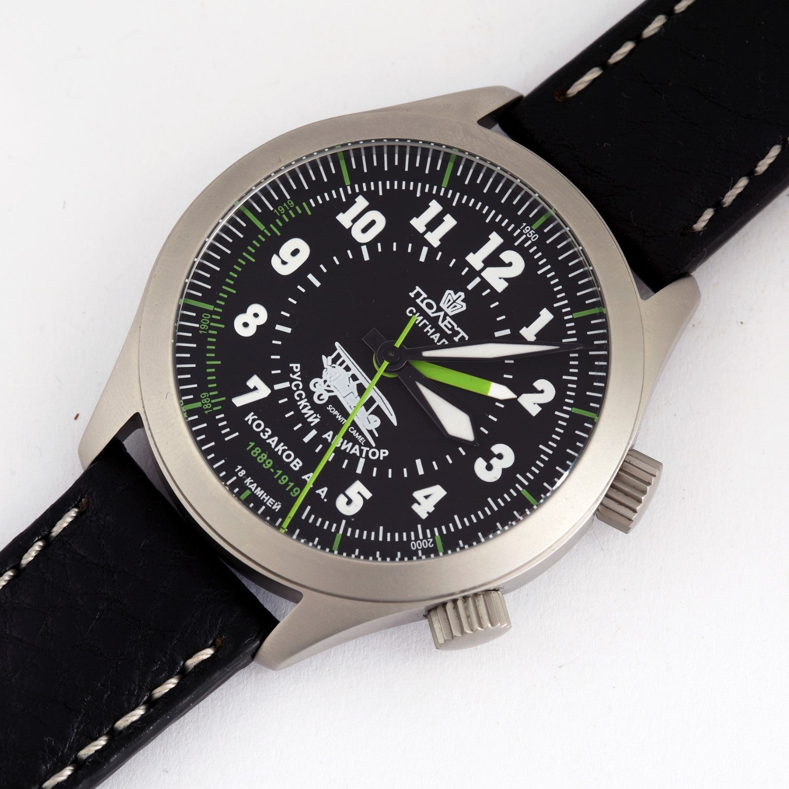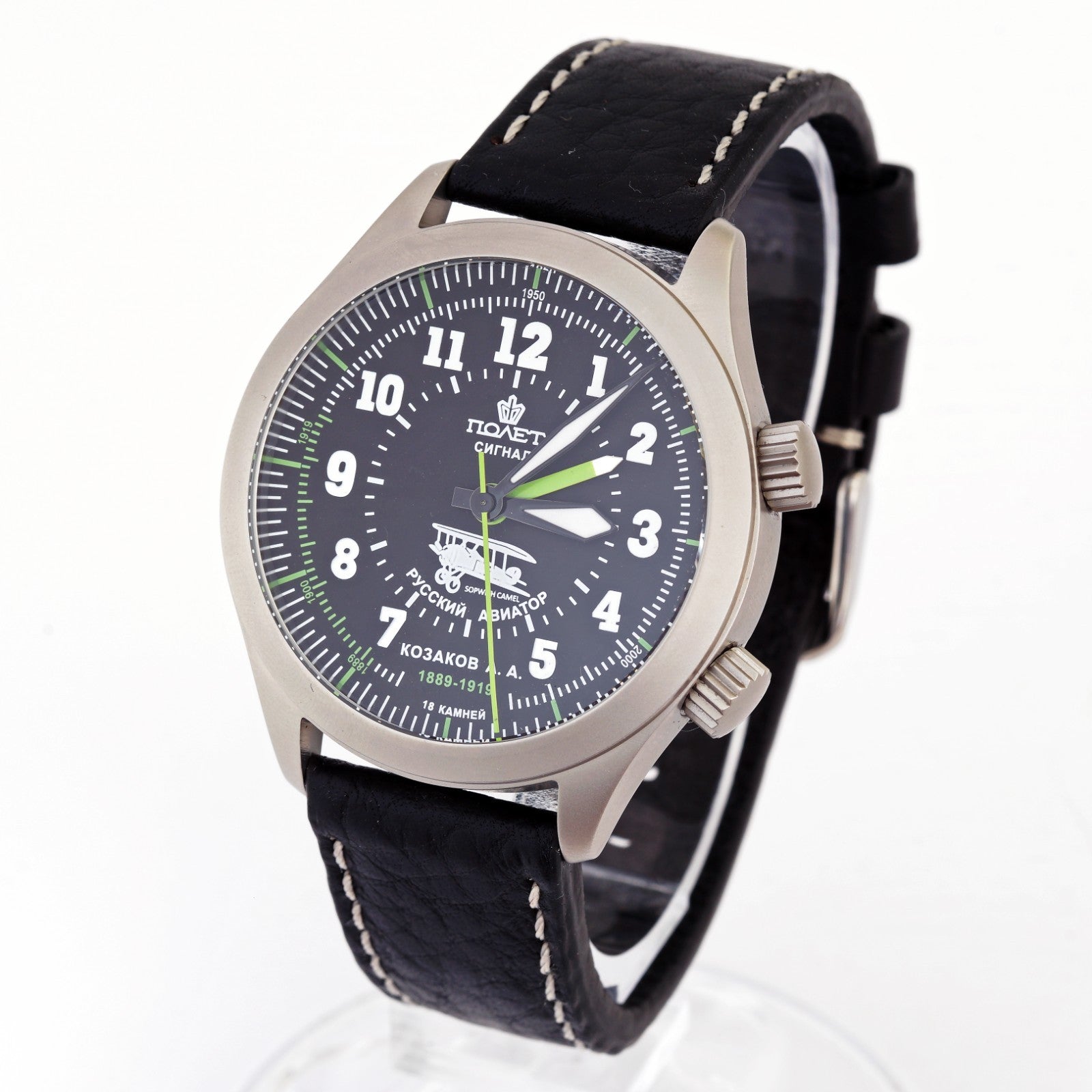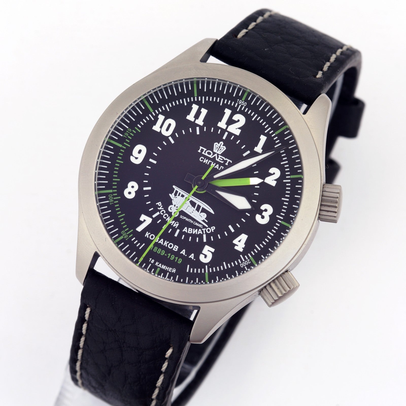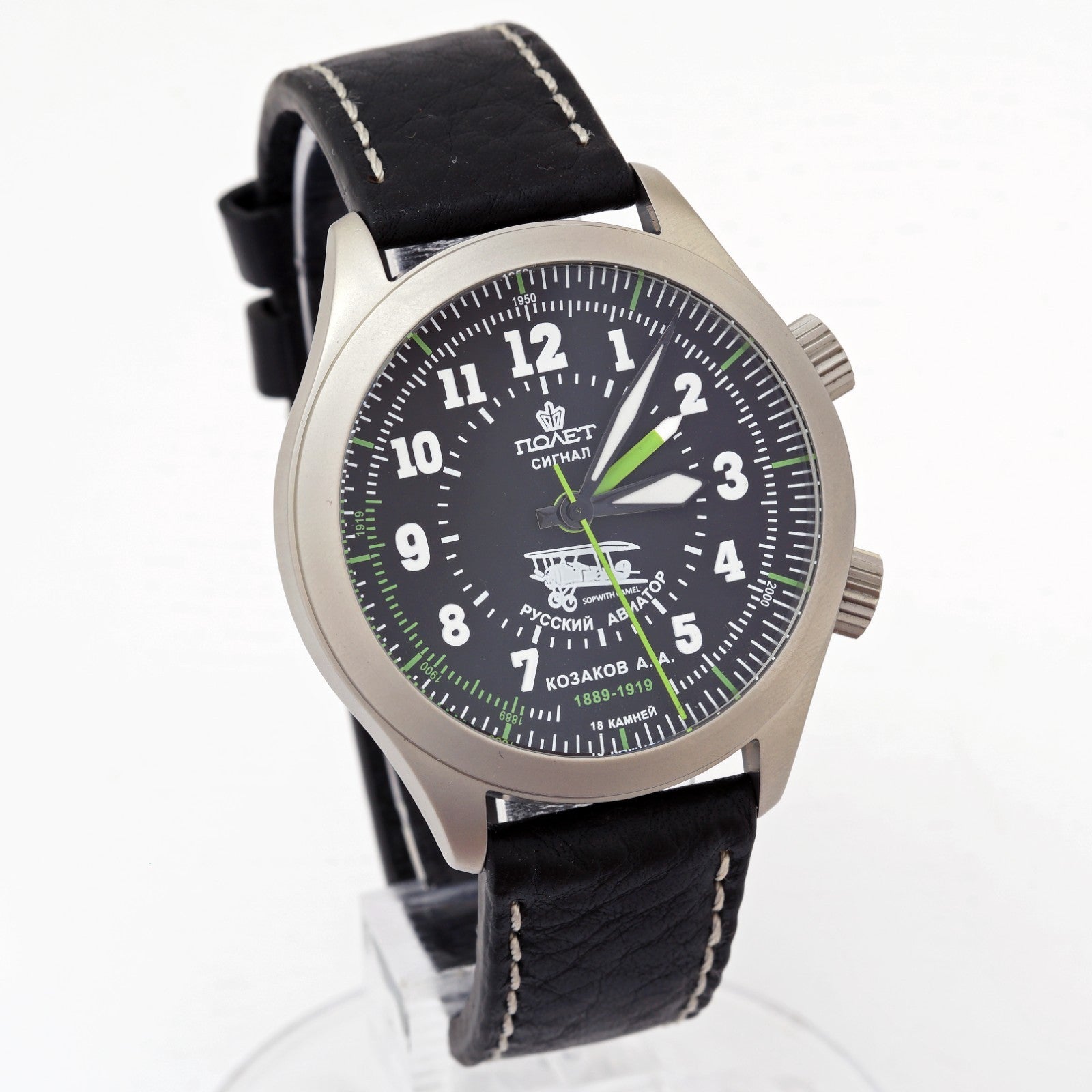 Inscriptions on the dial: Poljot signal, Russian aviator, 18 jewels, Kazakov A.A. 1889-1919